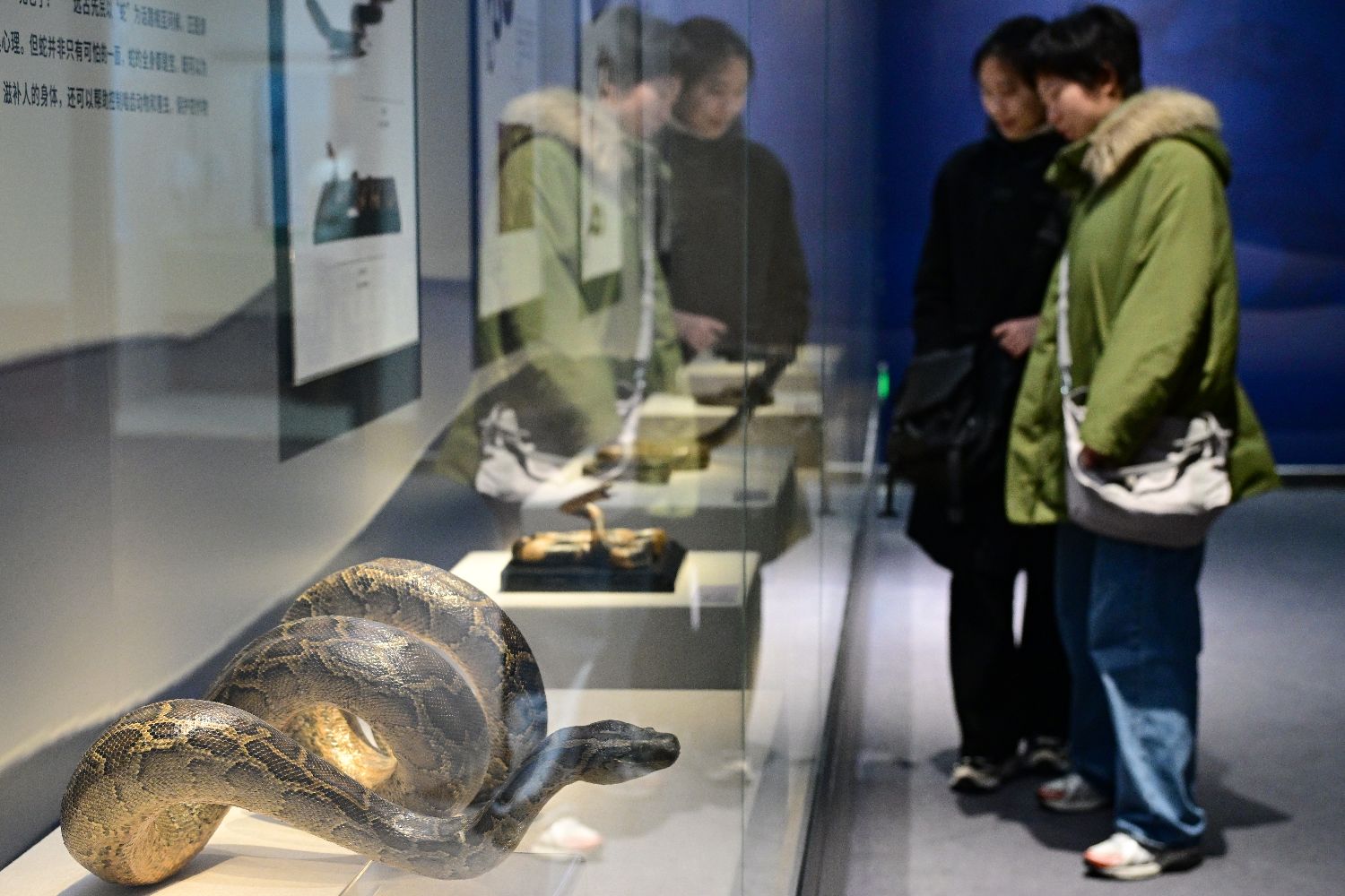 1月14日,小朋友在国家自然博物馆参观展出的王锦蛇标本。中新社