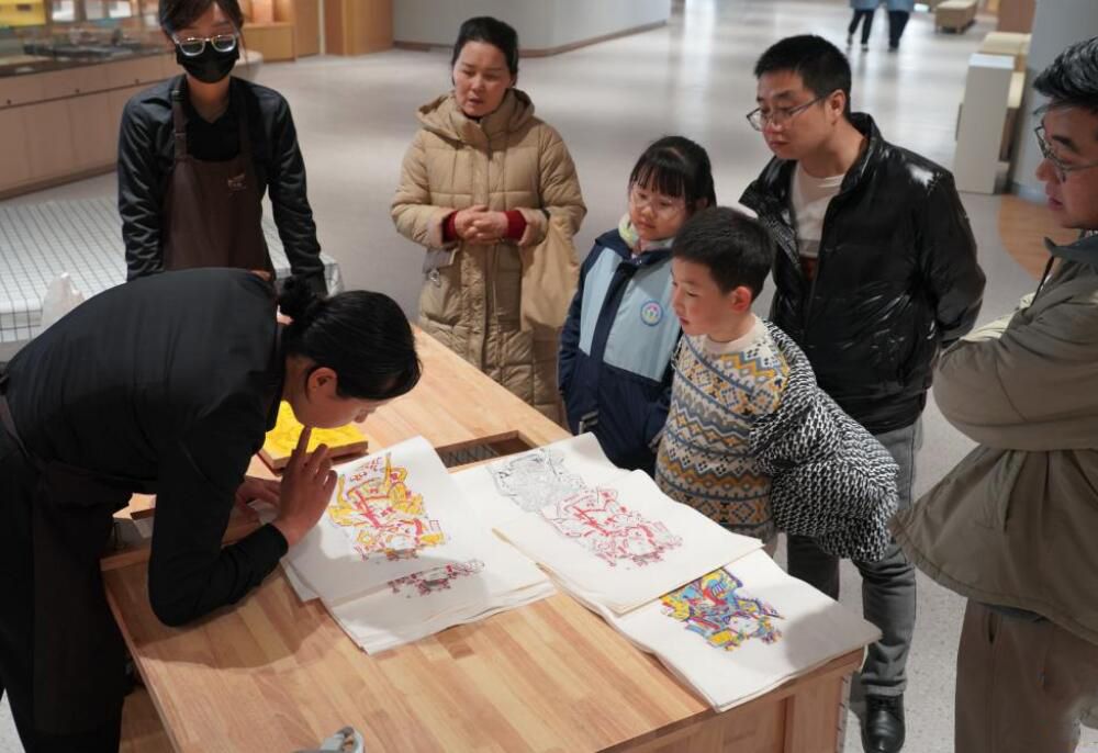 1月13日,参观者在新落成的长安书院内观看工作人员制作木版年画。