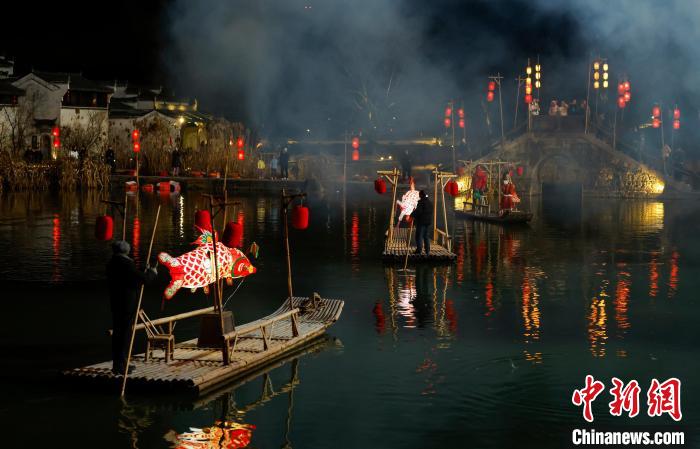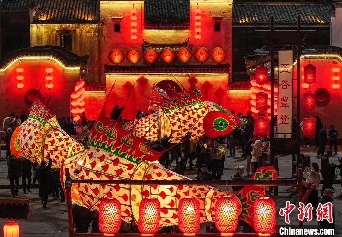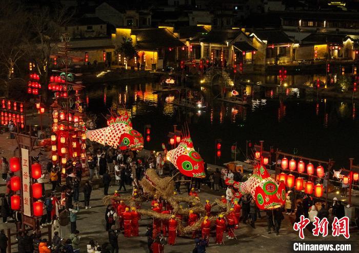 1月15日晚,一场以“盛世徽州 年味呈坎”为主题的非遗鱼灯会在安徽省黄山市徽州区呈坎古村火热上演。汪满田鱼灯、瞻淇鱼灯在古村灿烂灯火的映衬下轮番交替舞动,唯美浪漫,吸引了众多游客到场观赏体验,感受徽州民俗的浓浓年味。图为鱼灯表演队伍在古村巡游。中新网