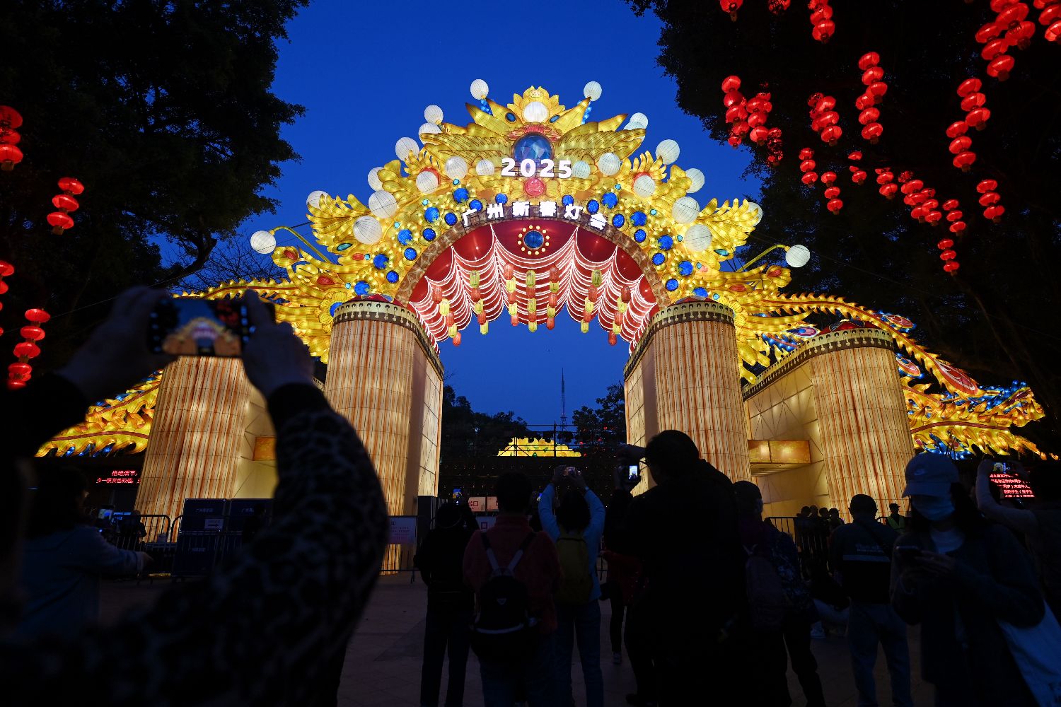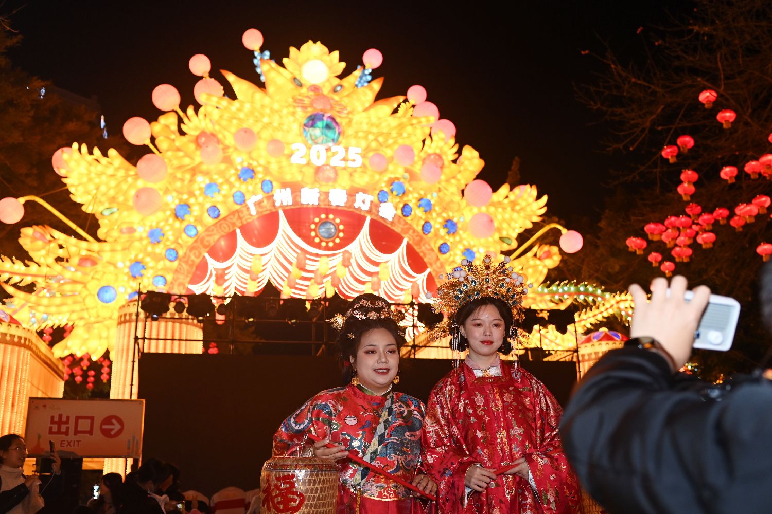 1月16日晚,2025年广州新春灯会在广州市越秀公园亮灯,今年灯会以“花开越秀,遇见锦鲤”为主题,共展出75组灯组。图为粤剧凤冠灯组吸引游客拍照。中新社