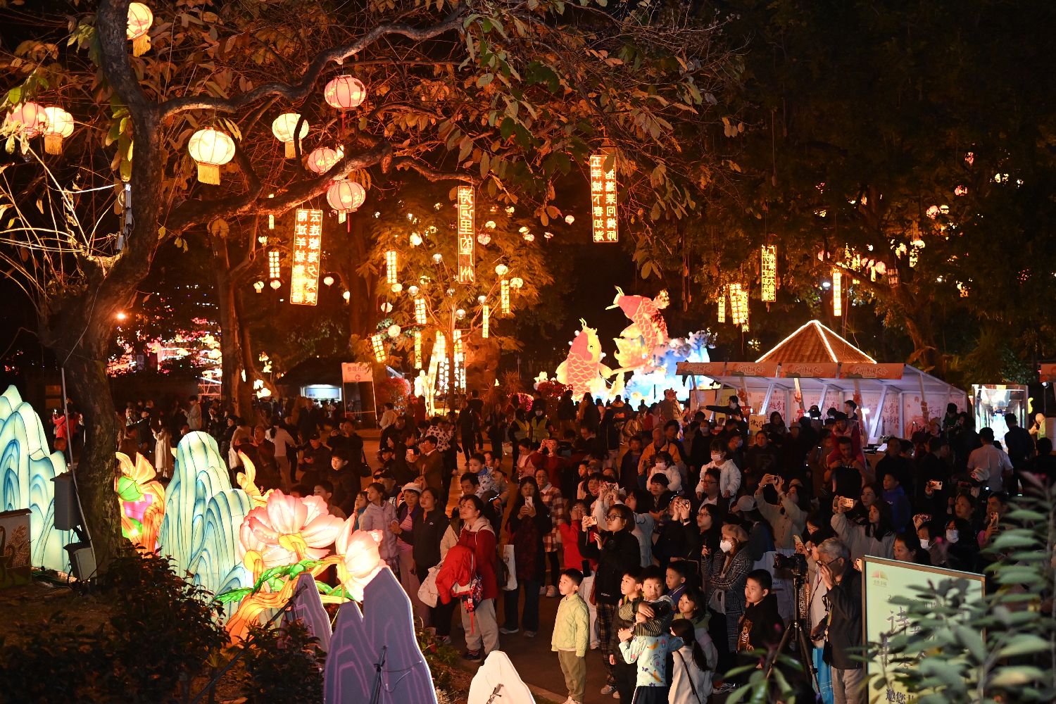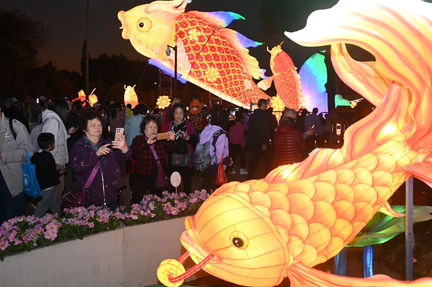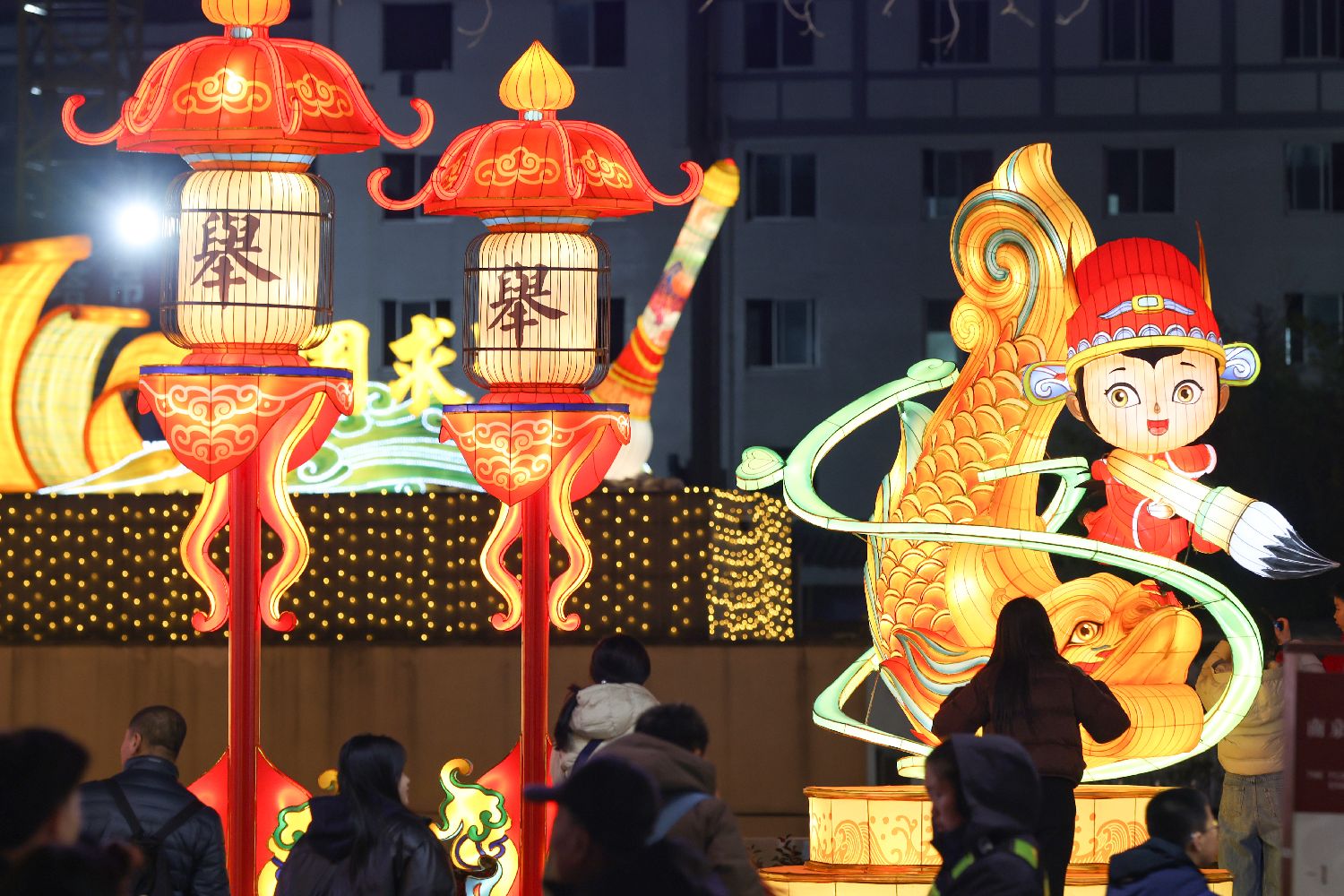 1月16日晚,锦鲤彩灯吸引游客拍照。中新社