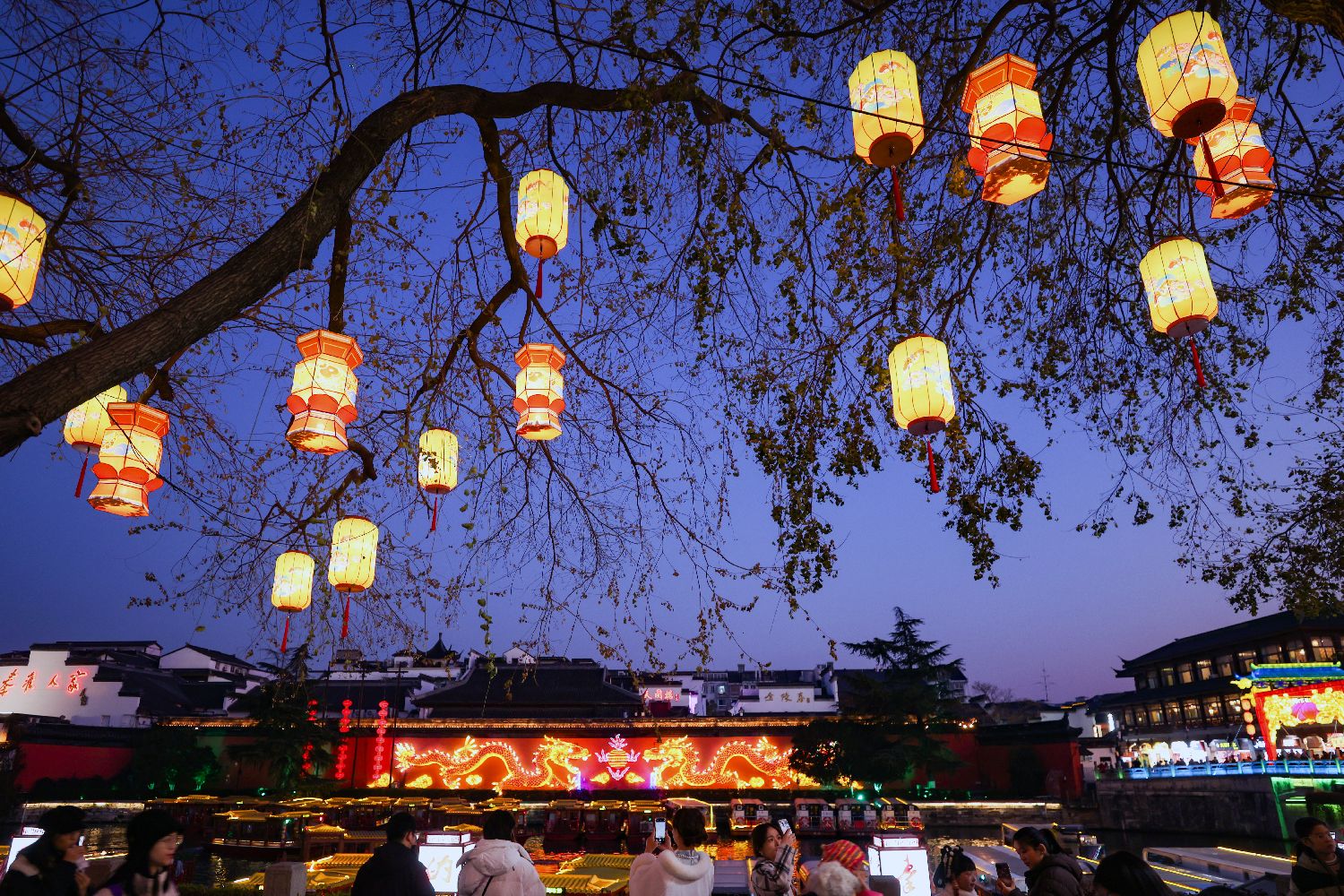 1月16日傍晚,游客们在南京秦淮河畔参观。中新社