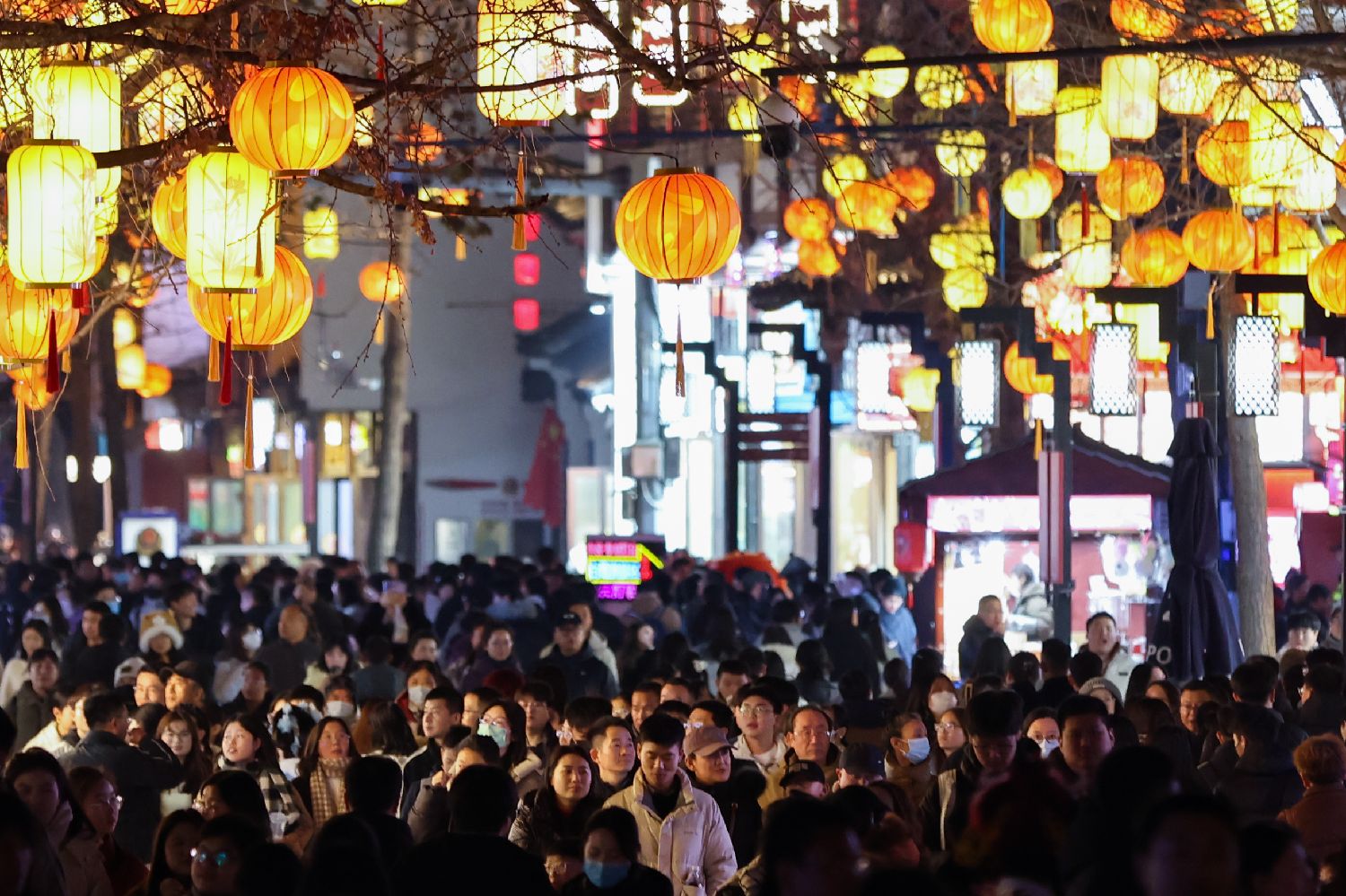 1月16日傍晚,游客们在彩灯高挂的秦淮河畔夫子庙景区内参观。中新社
