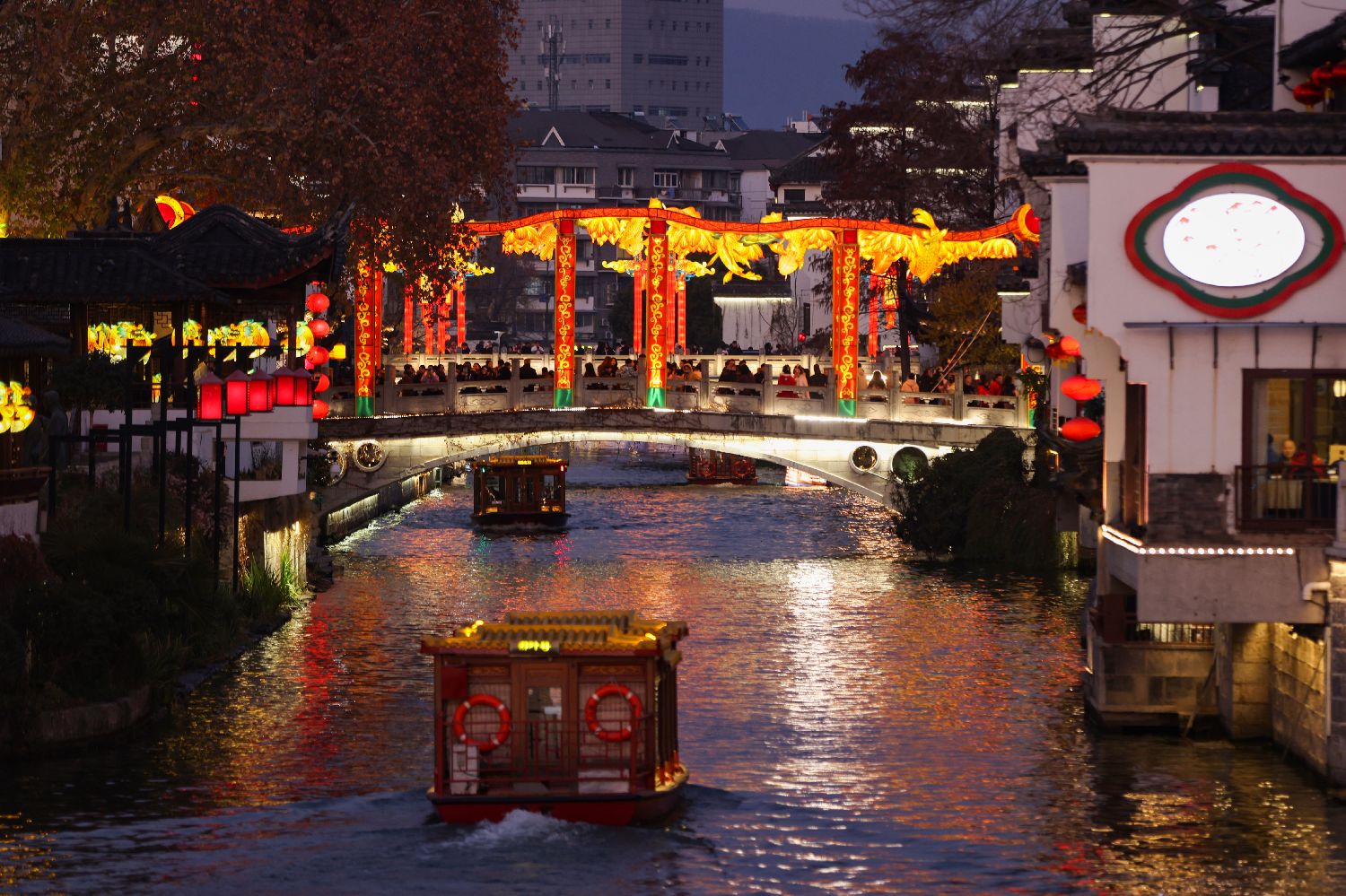 1月16日傍晚,载着游客的画舫在秦淮河文源桥下驶过。中新社