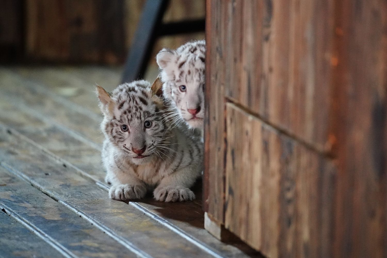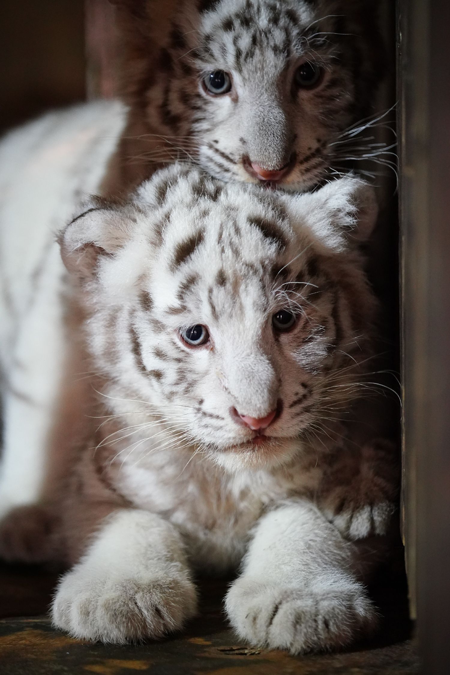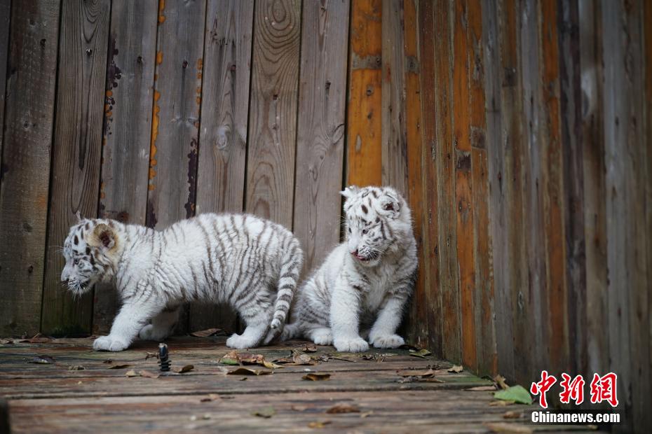 1月20日,两只小白虎探寻新环境。中新社