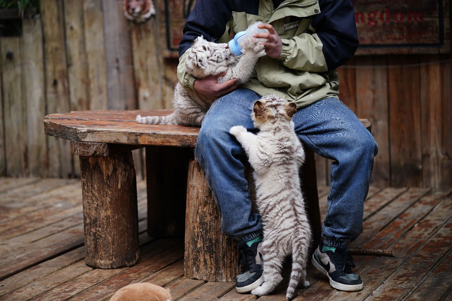 1月20日,饲养员给小白虎喂奶。中新社