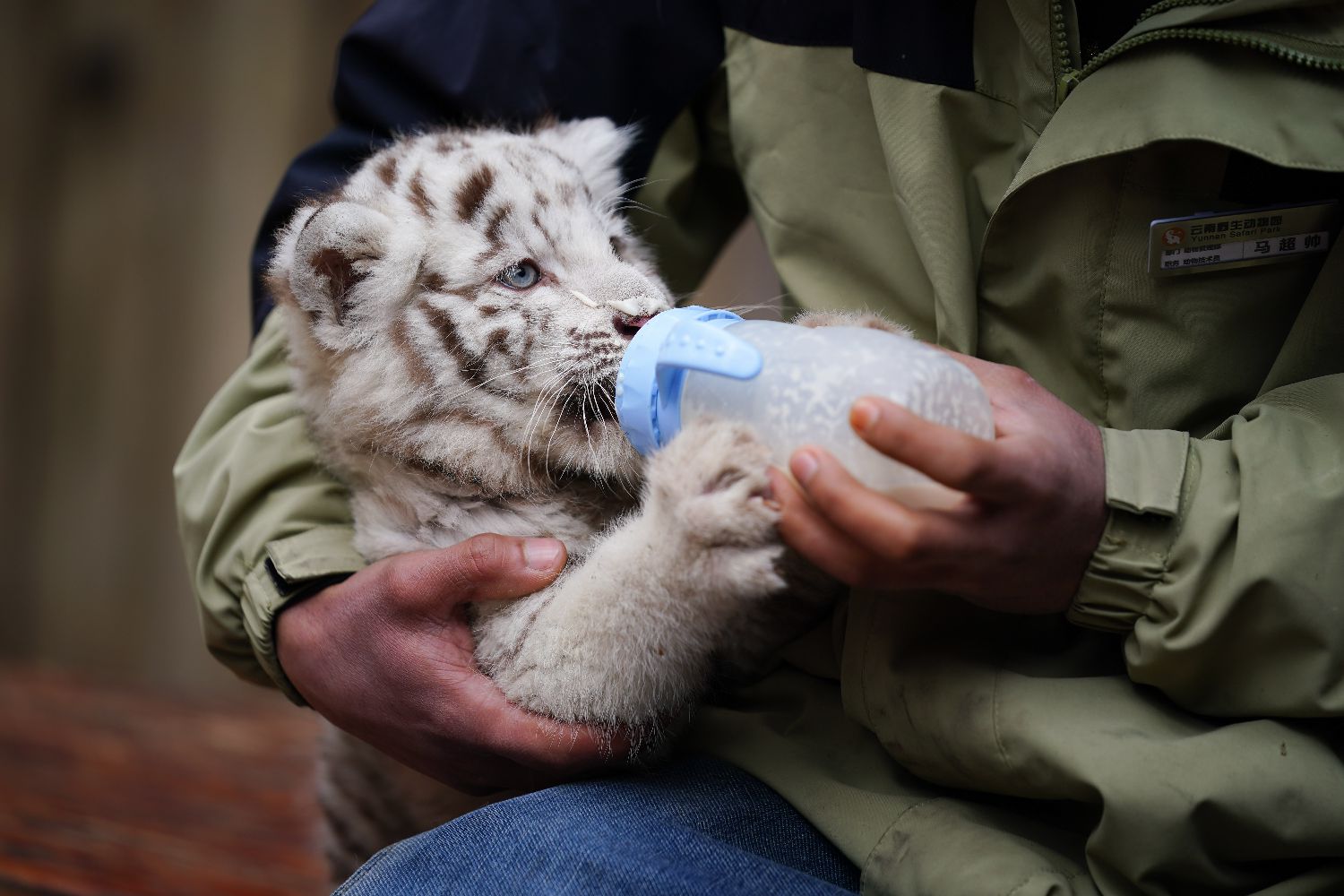 近日,云南野生动物园的两只孟加拉小白虎度过环境适应期后,在动物园的“虎宝幼儿园”亮相,正式与游客见面。图为1月20日,饲养员给小白虎喂奶。中新社