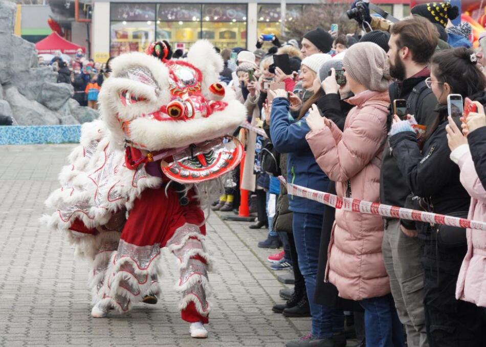 1月18日和19日,为期两天的新春庙会在匈牙利首都布达佩斯多瑙河东岸的唐人街举行。来自匈牙利及周边地区的数万民众相携游赏,共同欢庆即将到来的中国农历蛇年。图为1月18日,人们在匈牙利首都布达佩斯举行的新春庙会活动上观看舞狮表演。