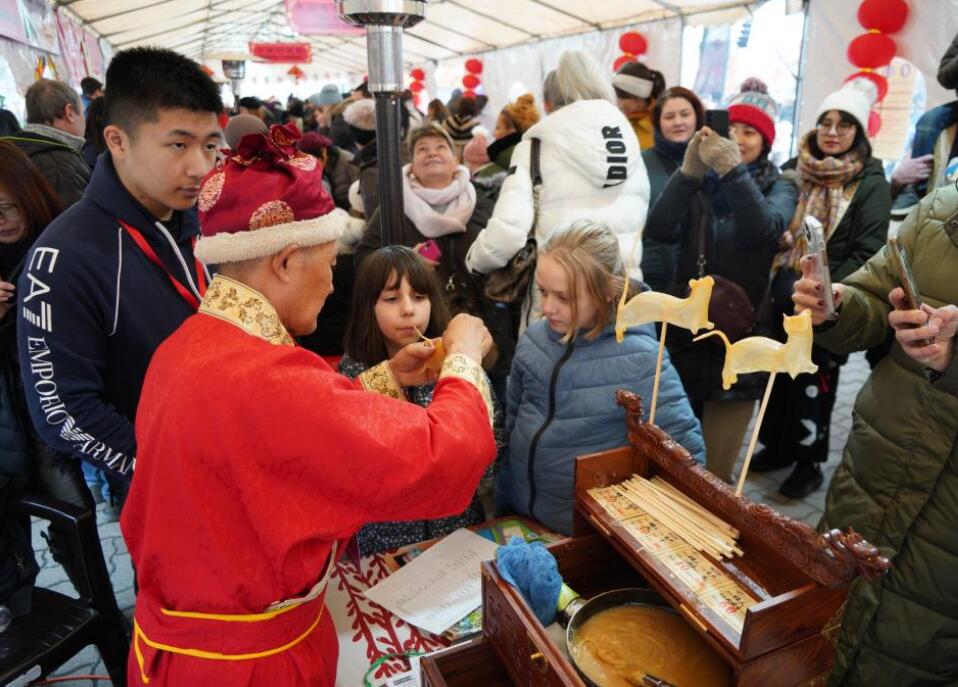 1月18日,一名女孩在匈牙利首都布达佩斯举行的新春庙会活动上体验吹糖人。