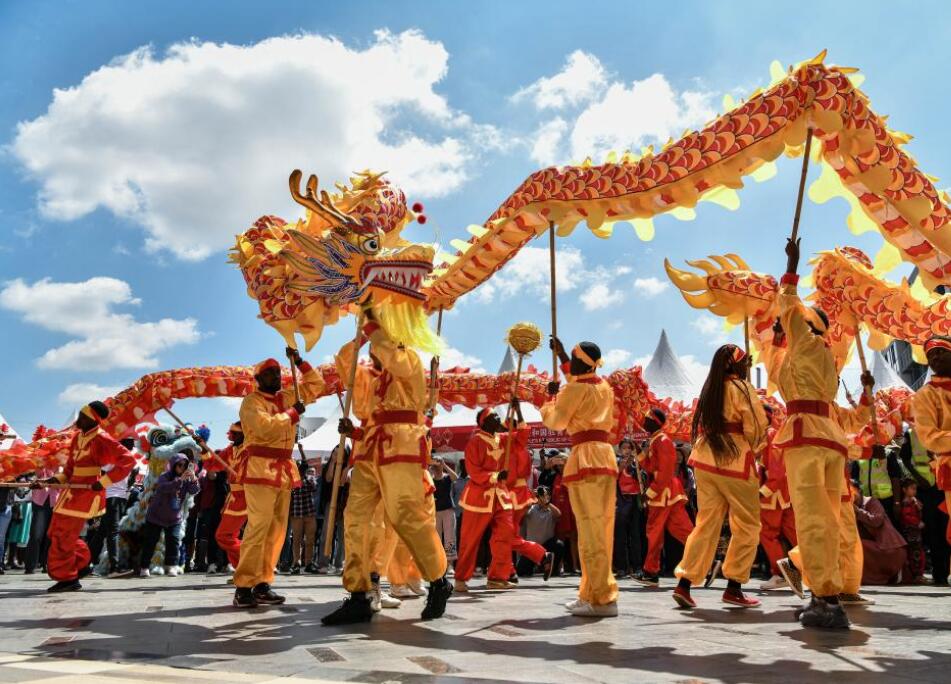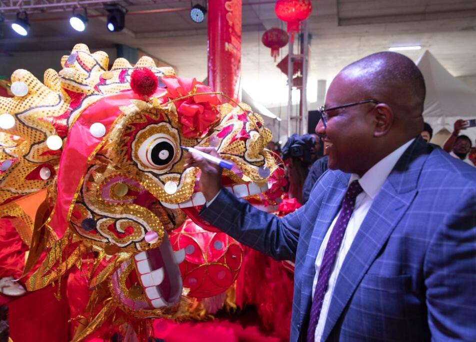 1月19日,赞比亚外交与国际合作部长汉贝在首都卢萨卡举行的春节庙会活动上为舞龙点睛。