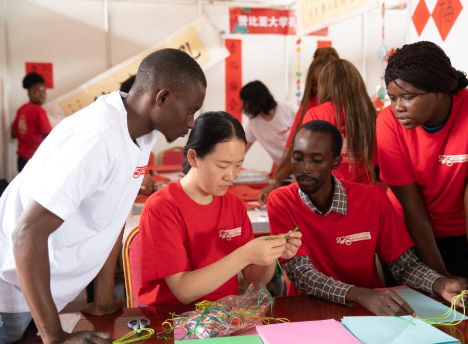 1月19日,在赞比亚首都卢萨卡举行的春节庙会活动上,赞比亚大学孔子学院的师生编制中国结。