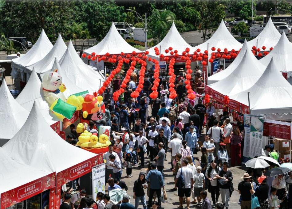1月19日,2025内罗毕中国春节庙会在肯尼亚首都内罗毕拉开帷幕,其中包括舞龙、舞狮、民间舞蹈、少林功夫表演以及中国美食展等活动。图为1月19日,春节庙会活动现场。