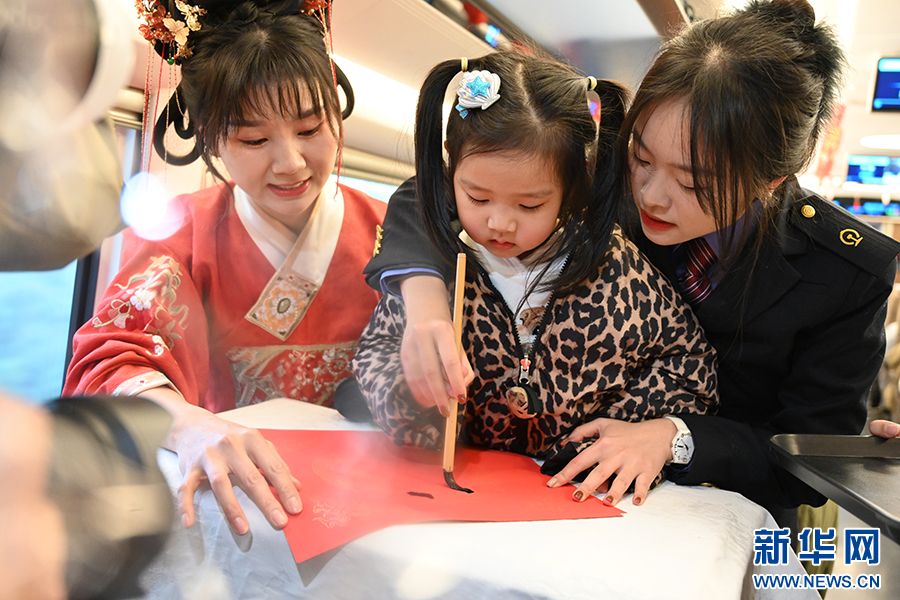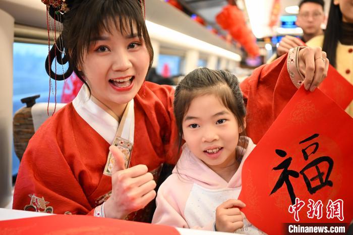 1月22日,在G8611次复兴号动车组车厢内,列车工作人员为一位小旅客赠送“福”字。中新网