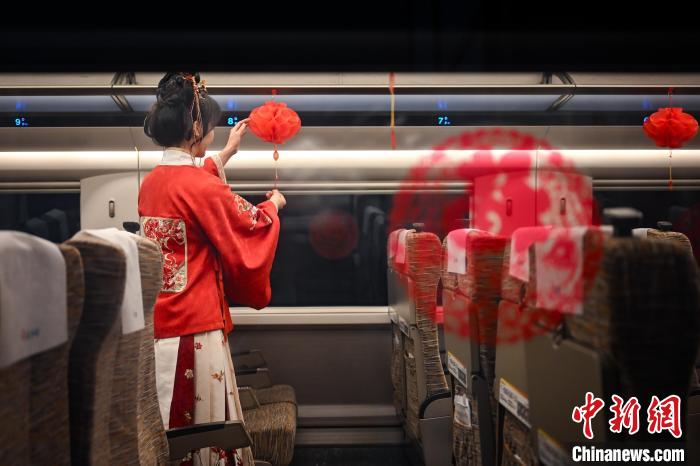 1月22日,在G8611次复兴号动车组车厢内,列车工作人员在装扮车厢。中新网