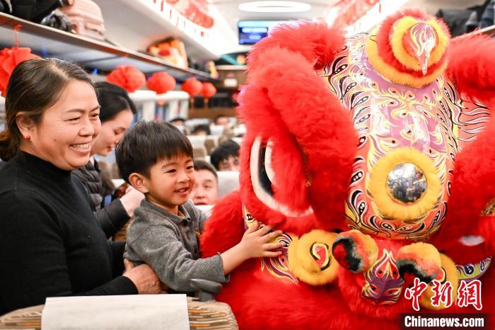 1月22日,在G8611次复兴号动车组车厢内,一位小朋友与舞狮互动。中新网