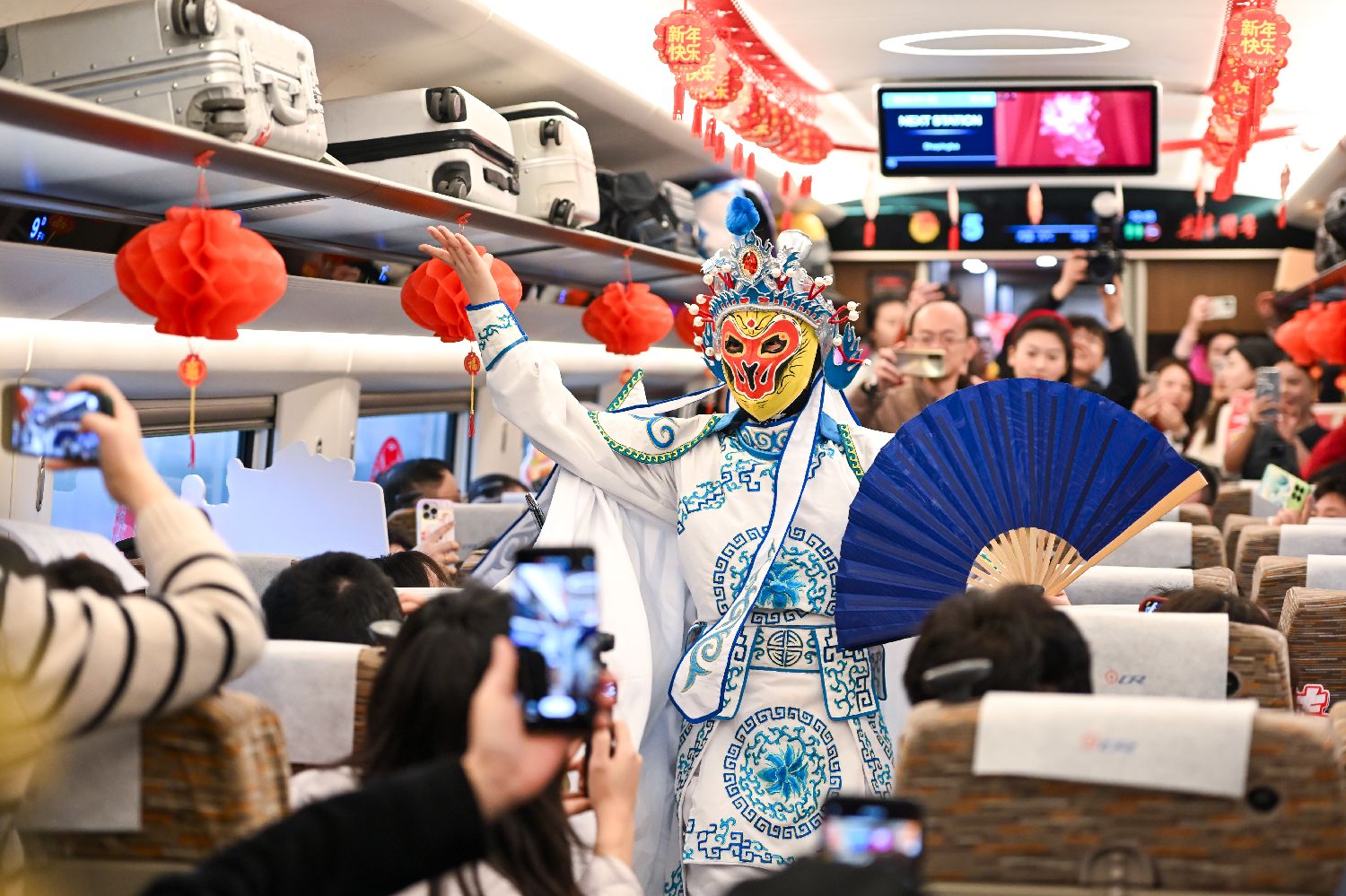 1月22日,当日是农历腊月二十三日,正值中国传统小年,中国铁路成都局集团有限公司重庆客运段与相关部门联合,在成都东开往沙坪坝的G8611次成渝城际复兴号高铁上举办了川剧变脸、舞狮等非遗表演,让旅客在春运旅途中近距离感受浓浓的年味。图为在G8611次复兴号动车组车厢内,旅客观赏川剧变脸表演。中新社