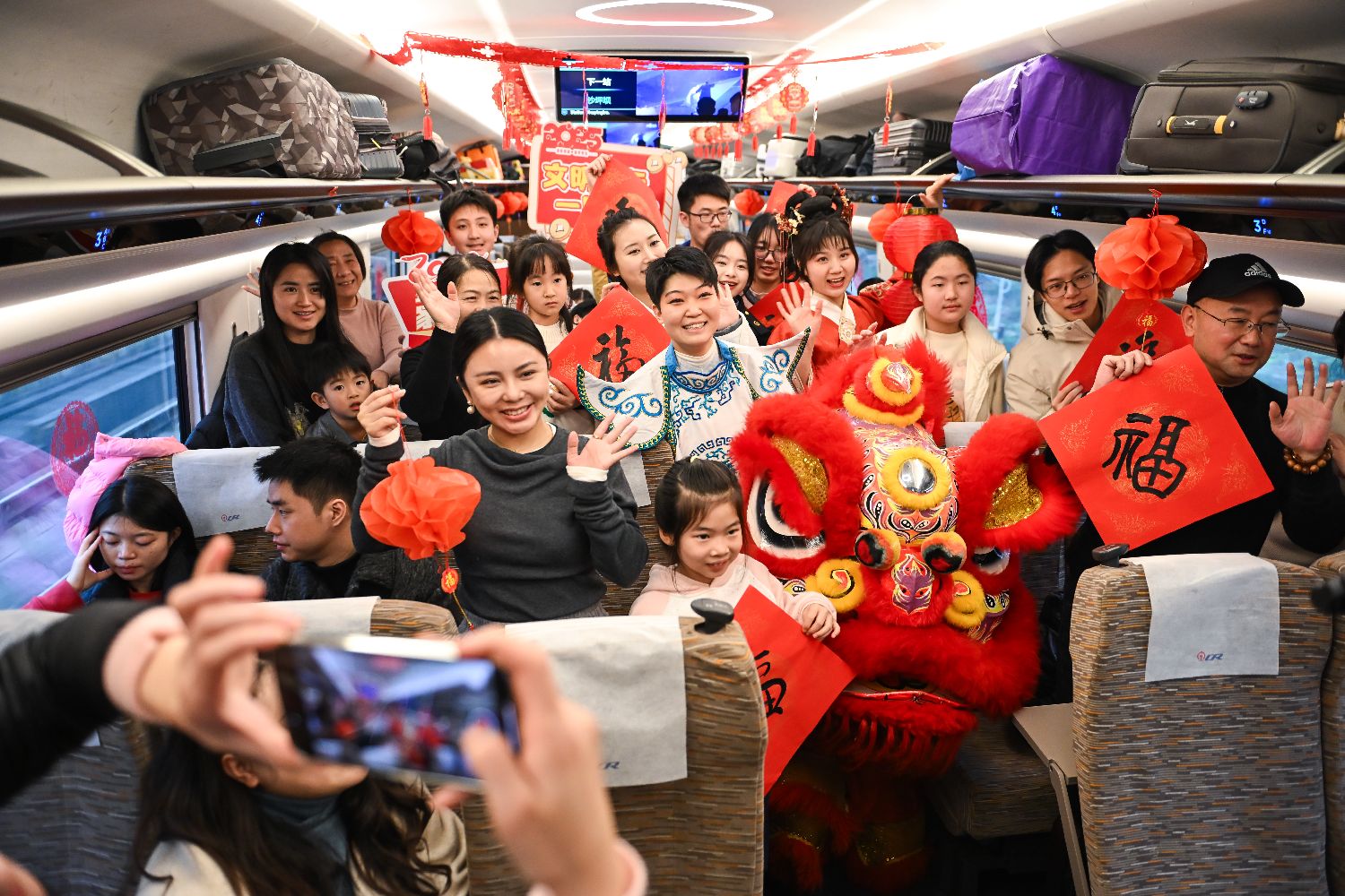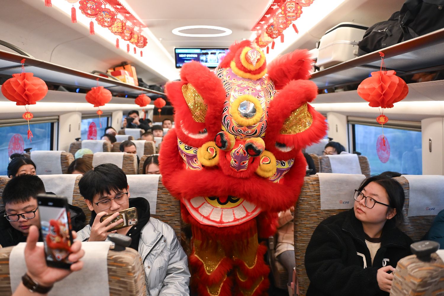 1月22日,在G8611次复兴号动车组车厢内,旅客观赏舞狮表演。中新社