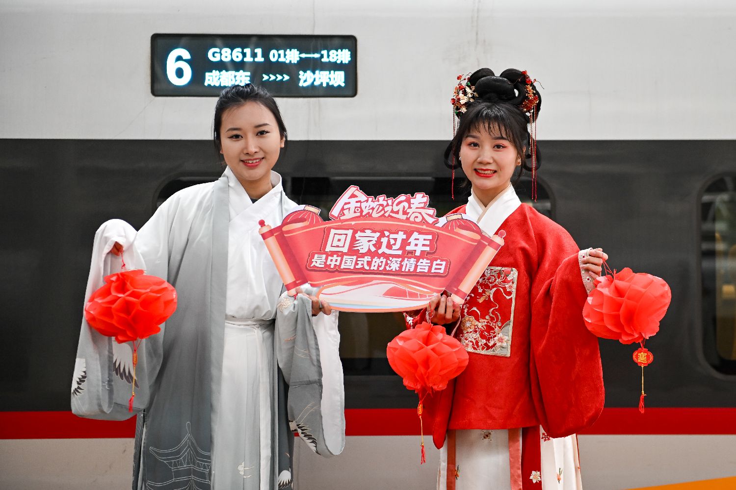 1月22日,成都东站,列车工作人员身着传统服饰迎接乘坐G8611次复兴号动车组的旅客。中新社