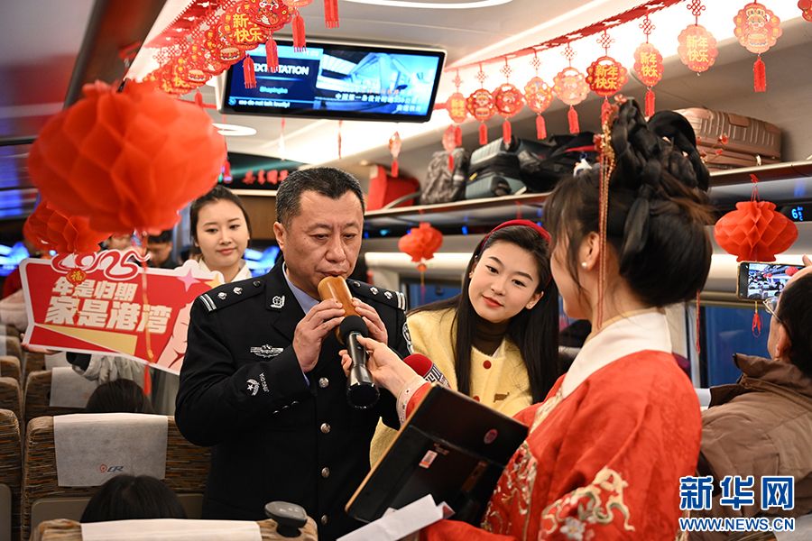 1月22日,G8611次复兴号动车组车厢内的埙孔表演。新华网
