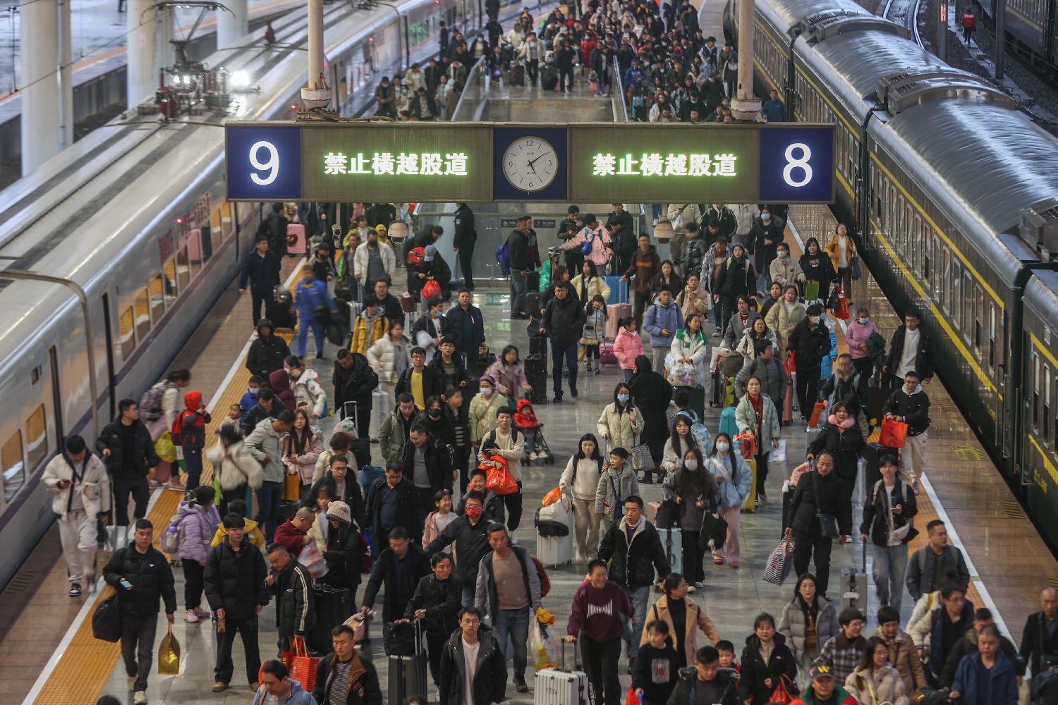 随着春节的临近,中国铁路春运迎来节前客流高峰,各车站客流大幅增长,人们纷纷踏上归家之旅。图为1月25日,江西南昌站,众多旅客从站台上走过。中新社