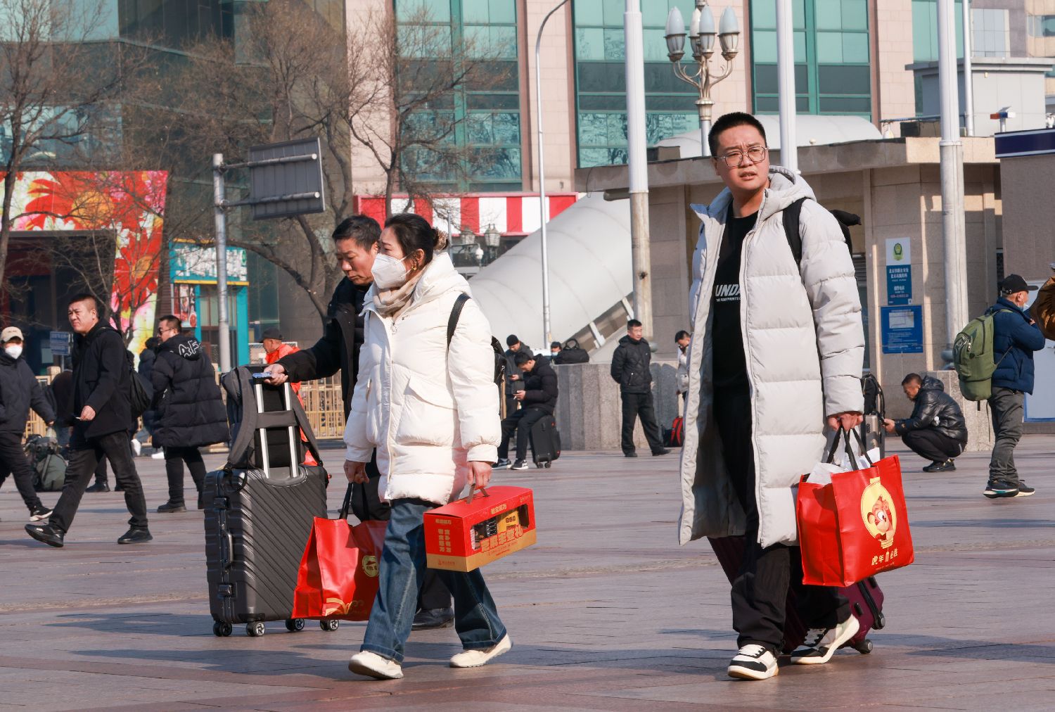 1月23日,旅客走过北京站前广场。中新社