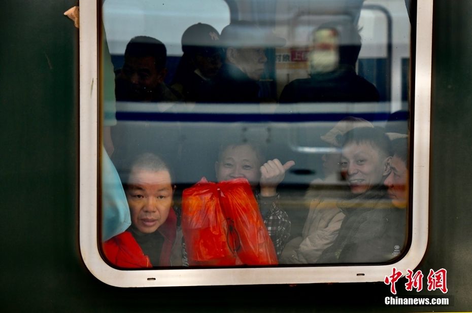 1月20日,在福建福州火车站,外来务工人员坐在车窗前等待列车发车。中新网