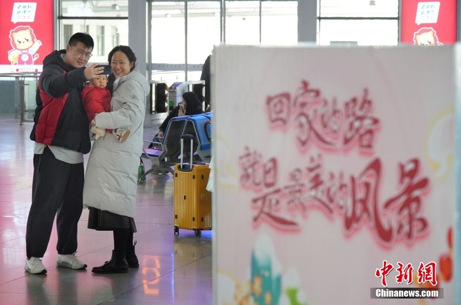 1月22日,准备返乡过年的一家三口在山东烟台站候车大厅合影。中新网