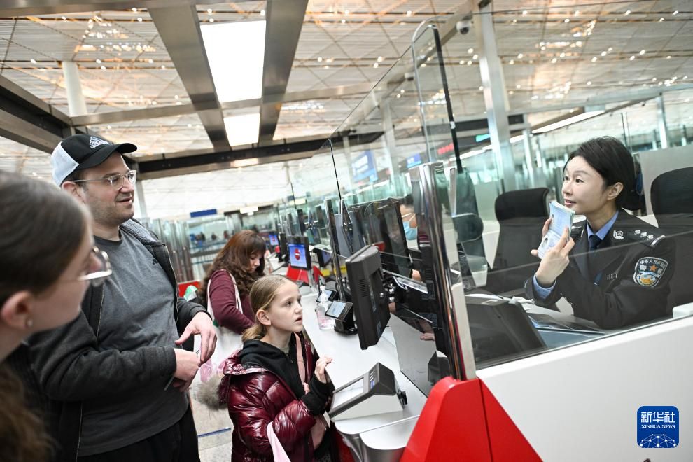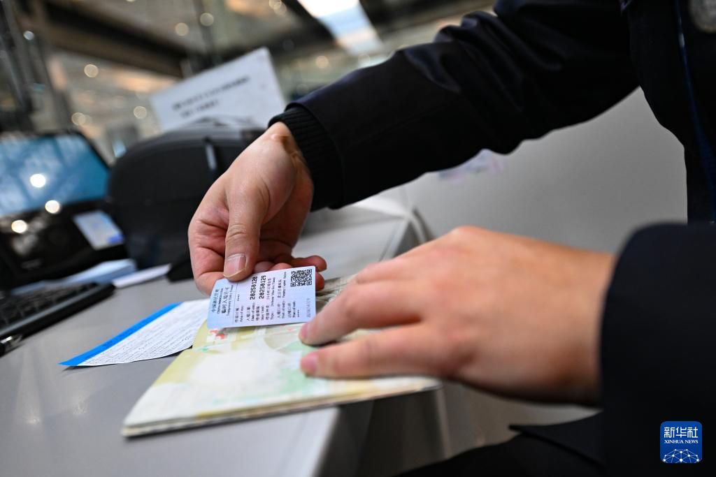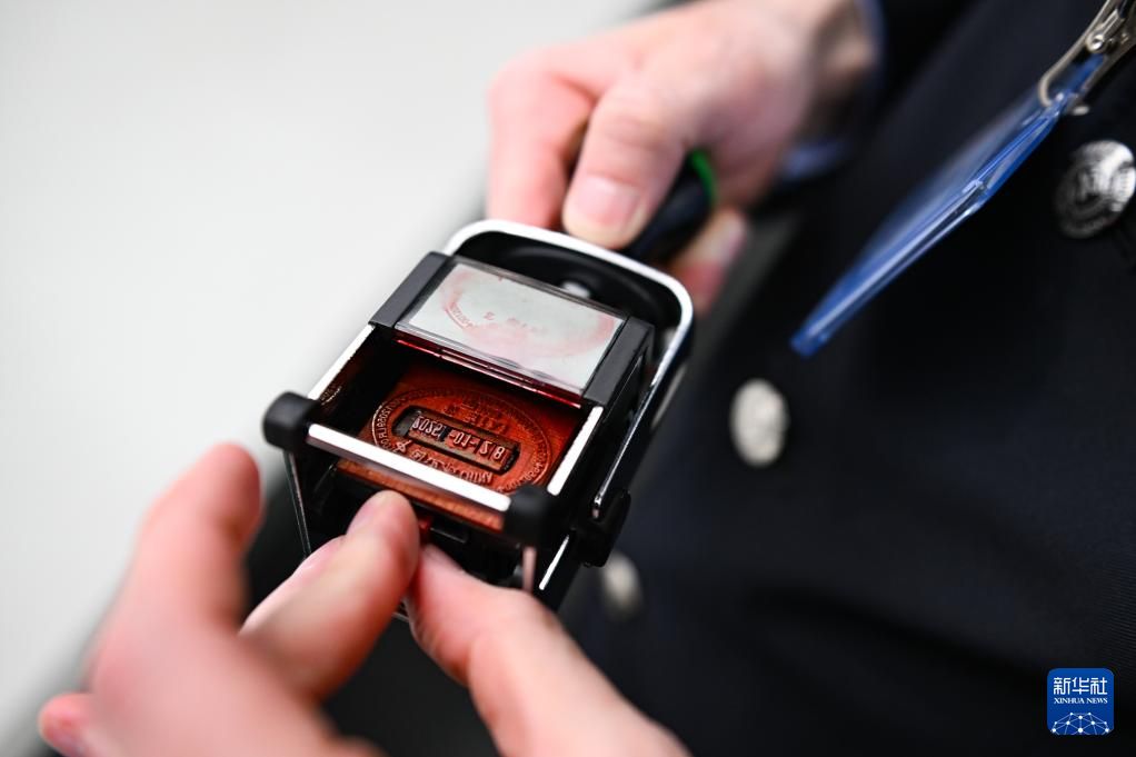 除夕,在北京首都国际机场,边检民警的入境章盖章声此起彼伏。一些海外游子回到祖国,与家人团圆;海外游客经此走进中国,感受中国年味儿。图为1月28日,边检民警在北京首都国际机场三号航站楼为一名英国旅客的护照贴上临时入境许可贴纸。