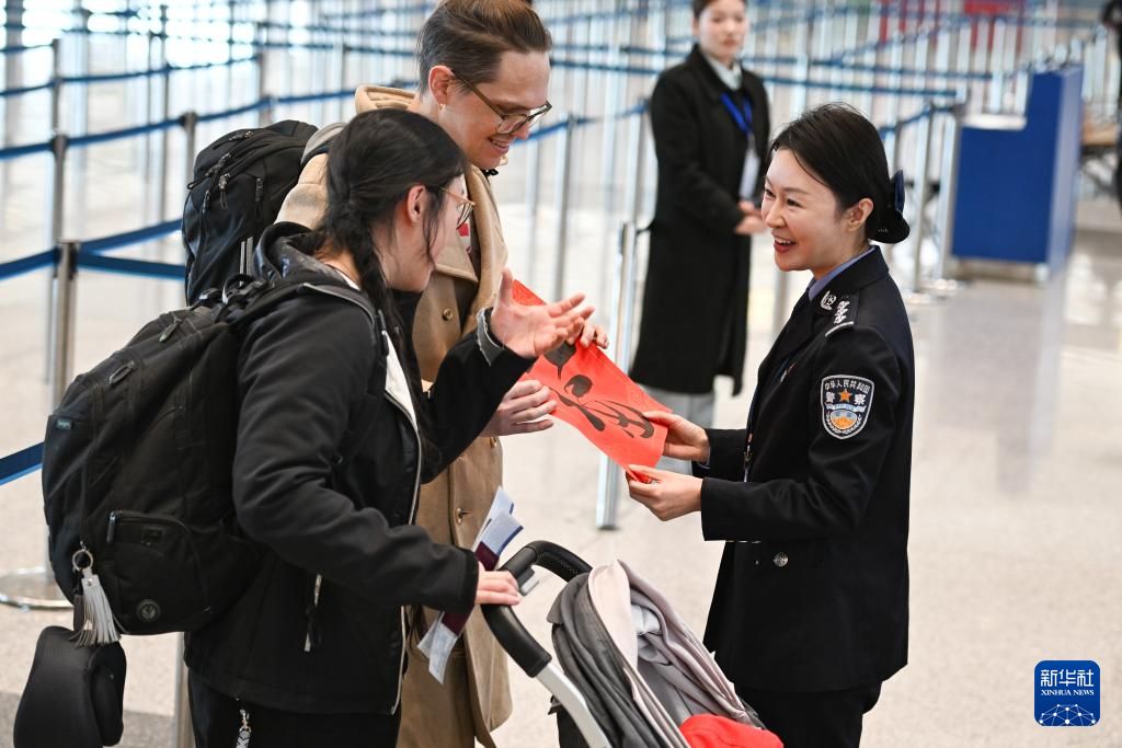 1月28日,边检民警陈苗(右一)在北京首都国际机场三号航站楼入境现场给旅客送“福”字。