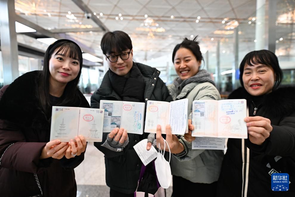 1月28日,4名韩国游客到中国旅游,并展示着护照上的入境章。