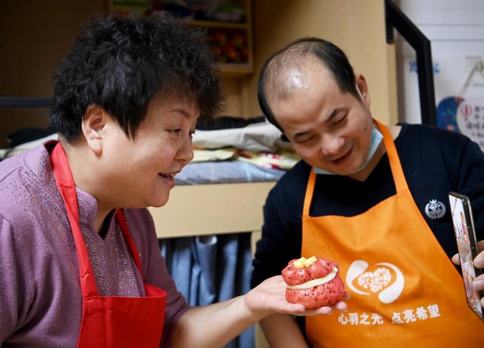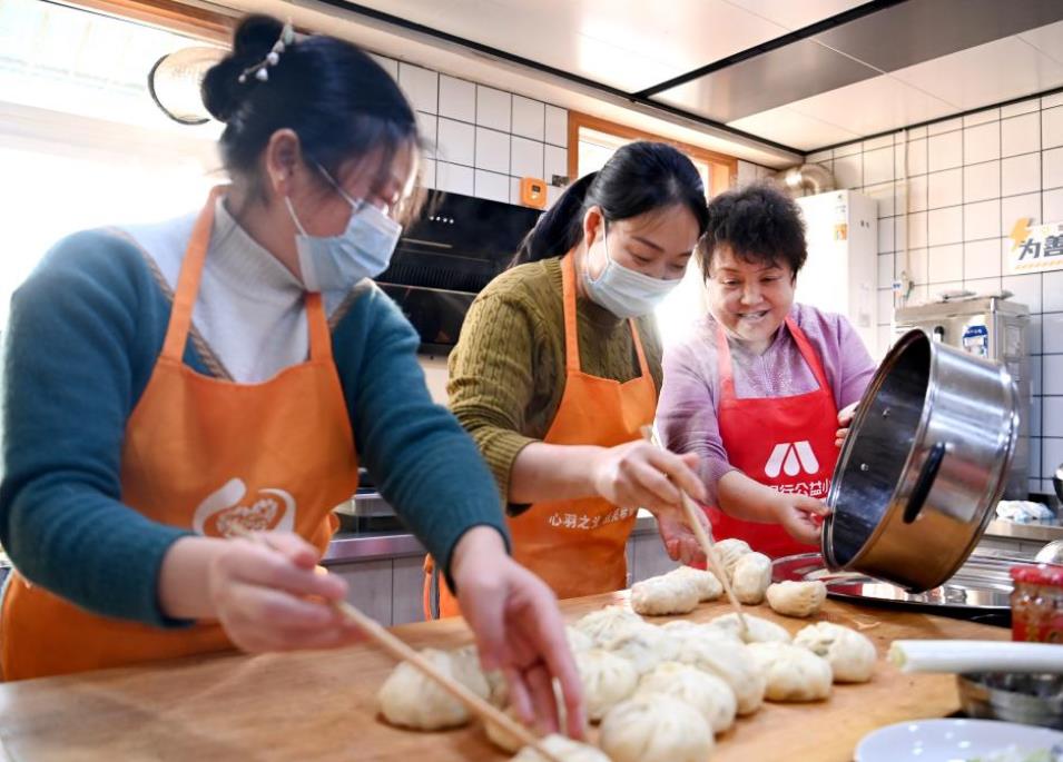 1月28日,常向阳(右一)在“心羽家园”和患儿家长一起做年夜饭。