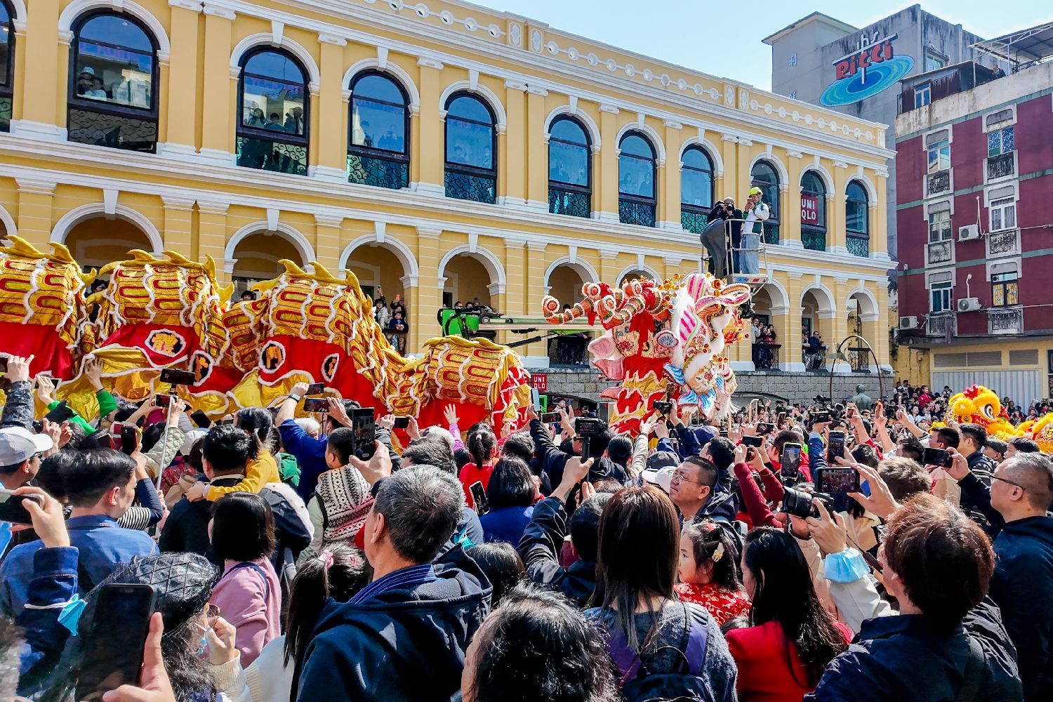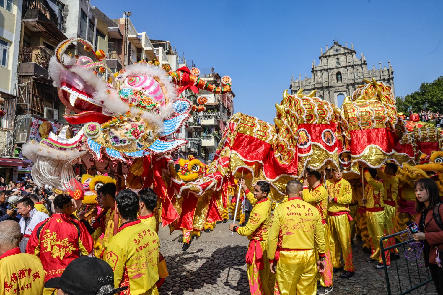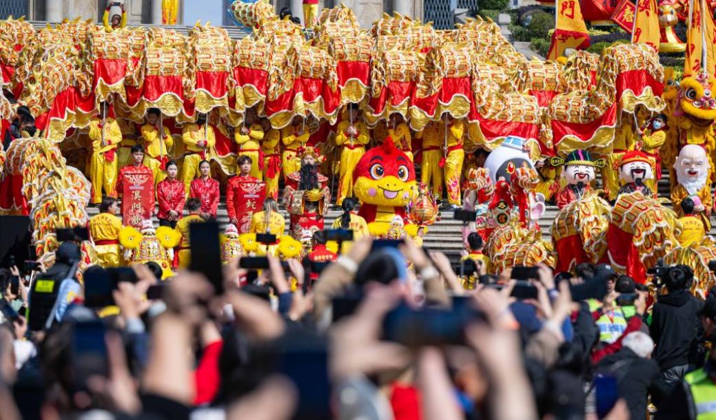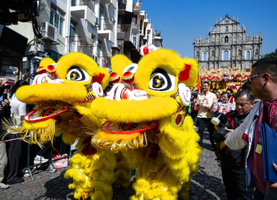 1月29日,澳门旅游局上午11时在大三巴牌坊及议事亭前地举办“欢乐春节——2025年龙腾舞跃贺新春”社区巡演活动,与澳门居民和旅客欢度春节。该活动安排238米长的大金龙及18头醒狮,联同财神、福禄寿三星、蛇生肖、金童玉女及澳门旅游吉祥物“麦麦”向澳门居民和旅客拜年及派送金元宝。在巡游队伍的带领下,嘉宾们由大三巴牌坊到达议事亭前地燃放炮竹,寓意“炮竹一声除旧岁”,揭开一连两日巡演活动的序幕。图为长238米的大金龙在大三巴牌坊前起舞,沿途向市民和旅客拜年,吸引大批游人到场。香港中通社