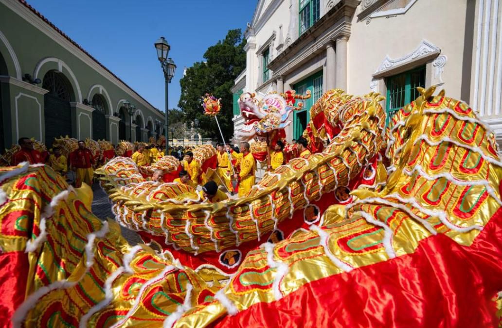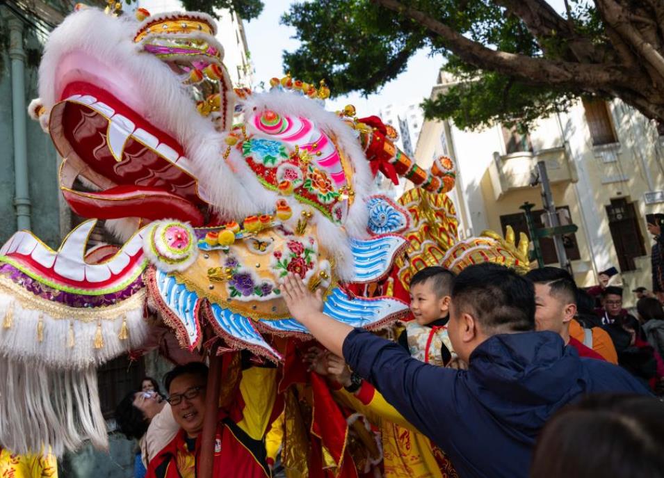 舞龙队伍在澳门风顺堂区与市民互动。新华社