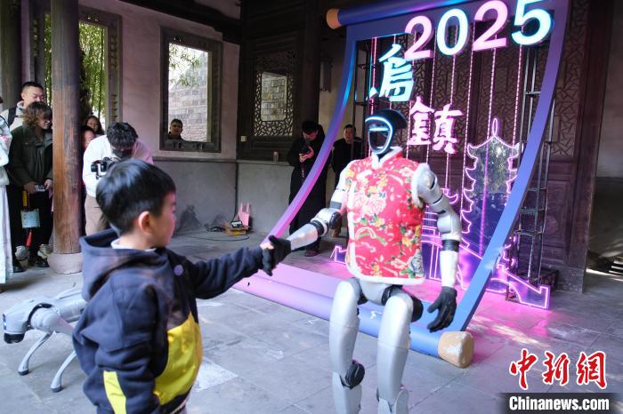 春节期间,浙江嘉兴乌镇景区内,机器人拜年表演吸引民众感受智慧乌镇的科技年味。图为1月30日,机器人与小朋友握手互动。中新社