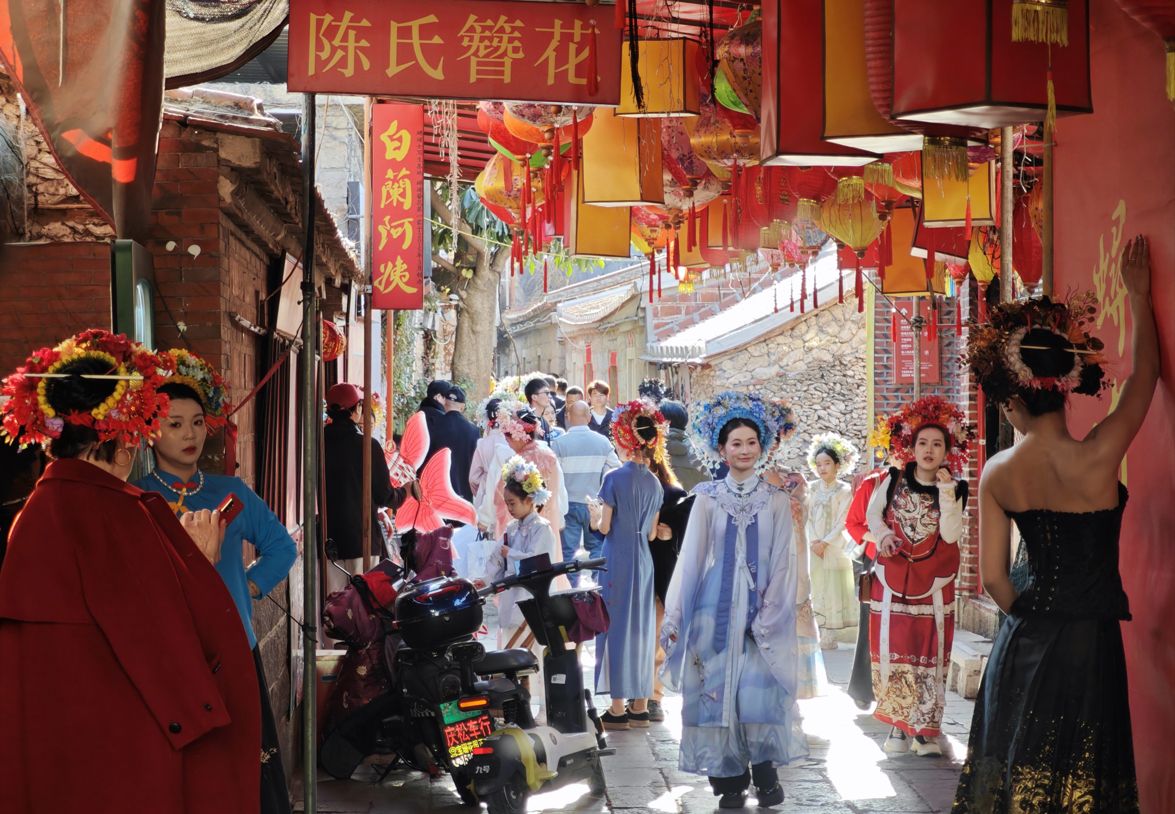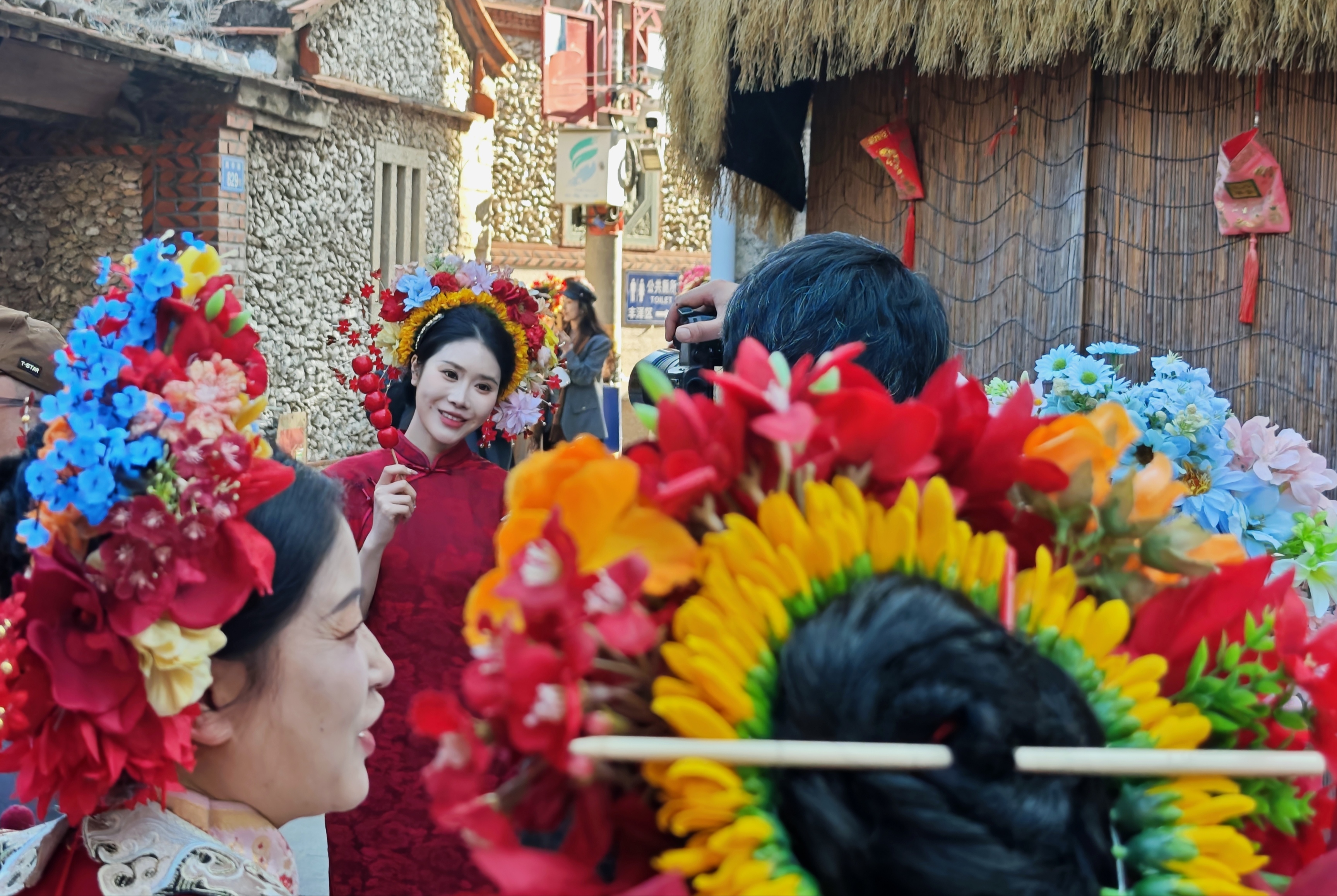 1月30日,游客头戴“簪花围”在蟳埔村游览、拍照。中新社