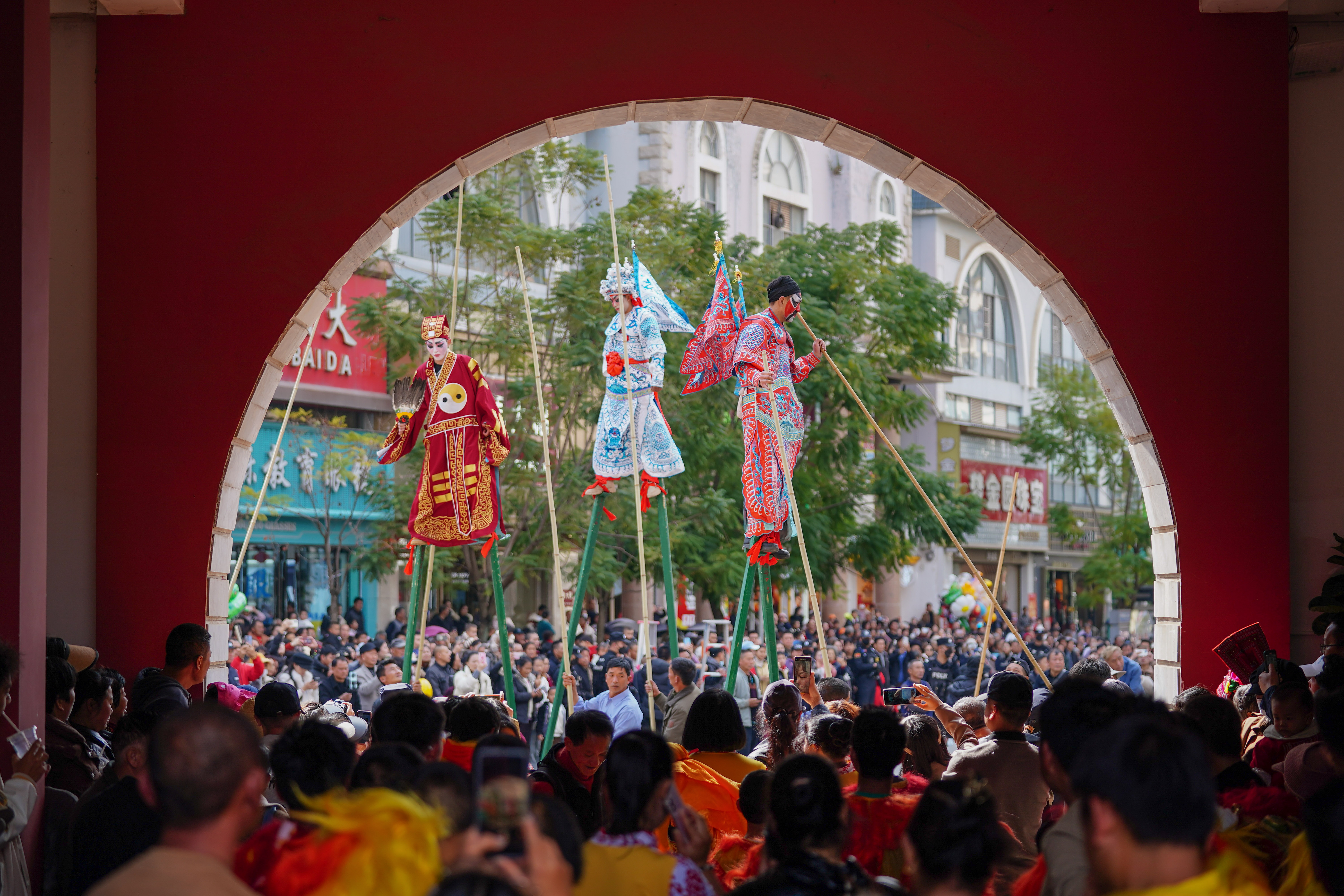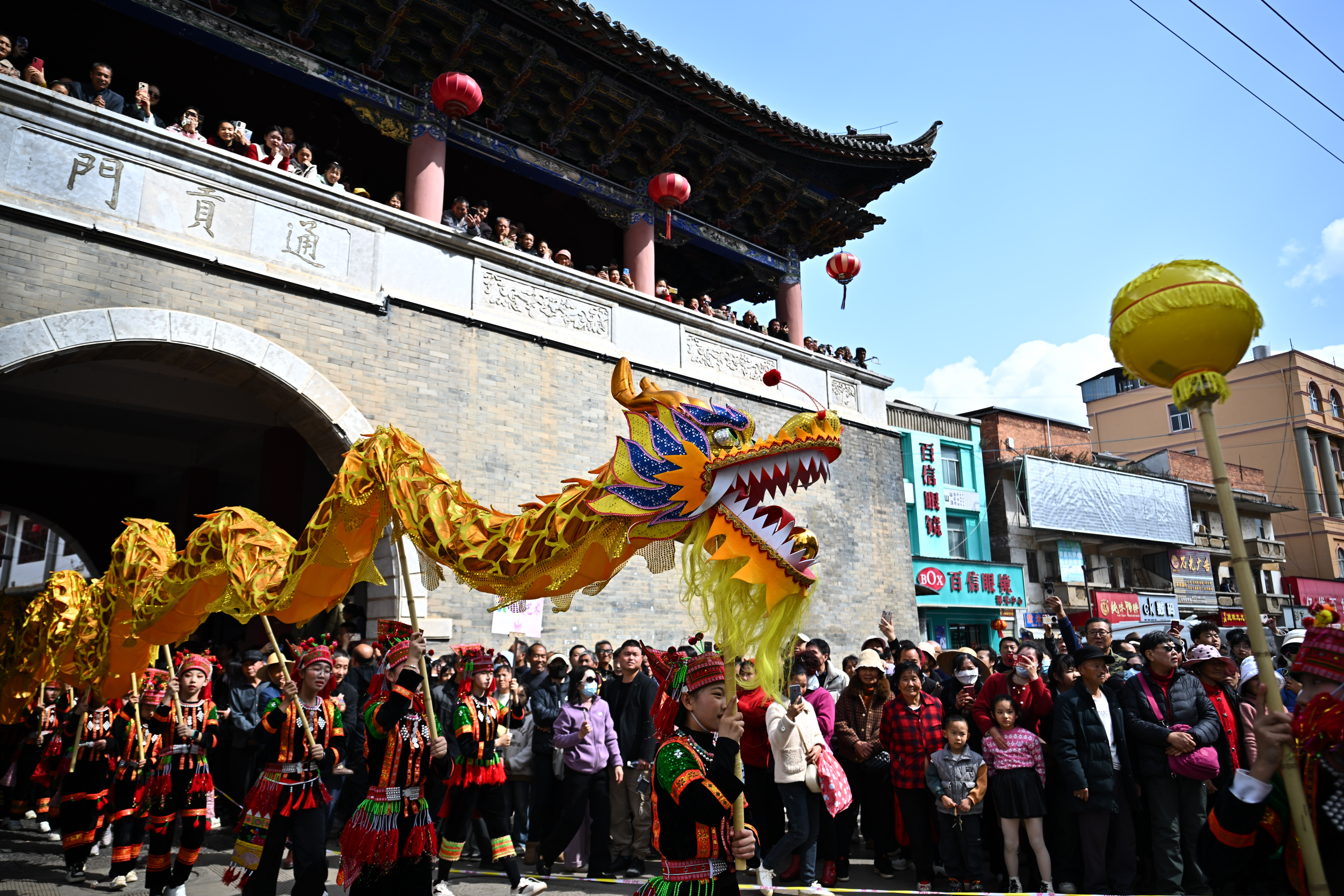 1月30日,云南省红河哈尼族彝族自治州石屏县举行传统民俗巡演,为民众献上富有地方特色的春节民俗文化盛宴。图为巡游队伍走过城门。中新社