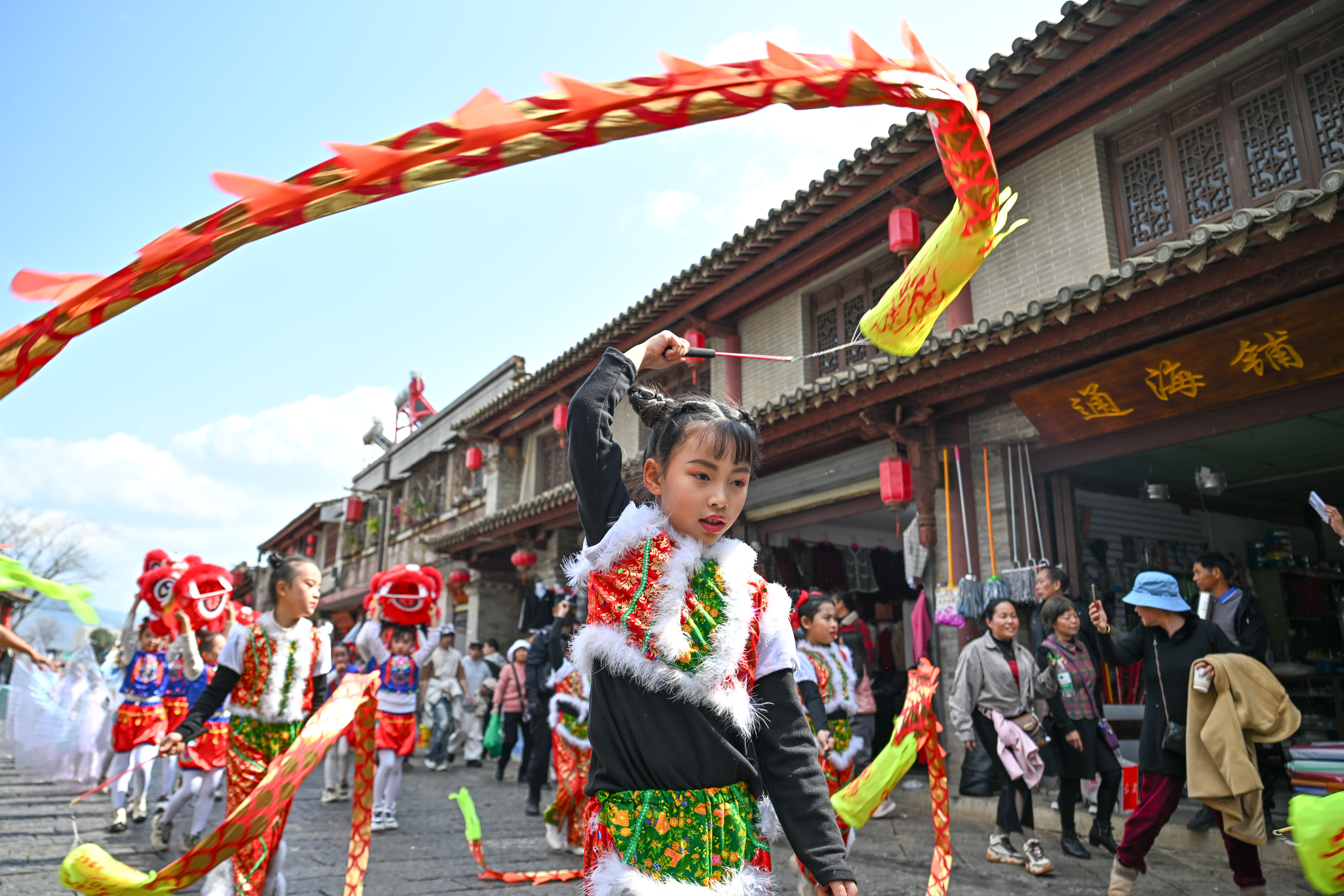 1月30日,云南省红河哈尼族彝族自治州石屏县举行传统民俗巡演,为民众献上富有地方特色的春节民俗文化盛宴。图为小朋友进行巡游表演。中新社