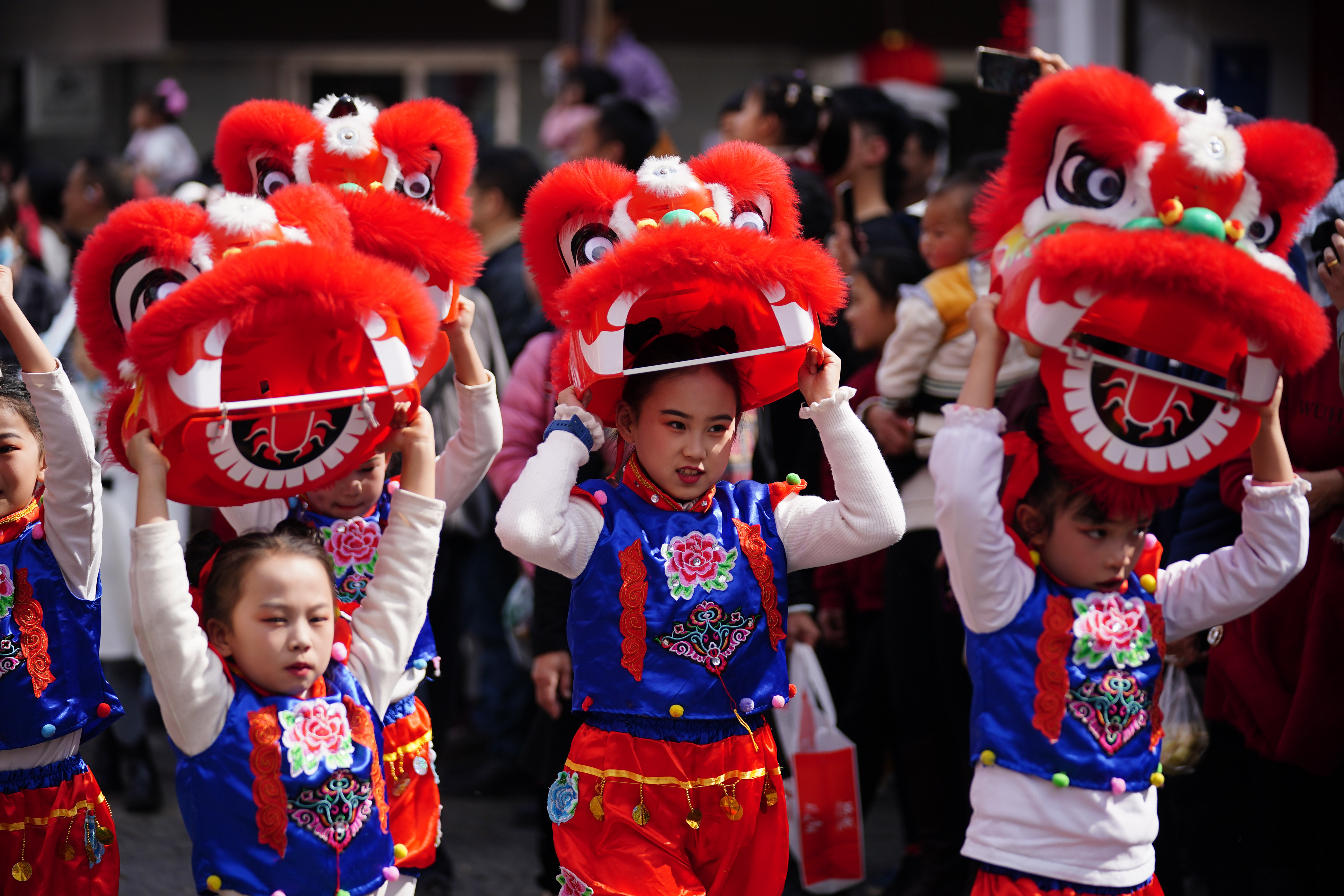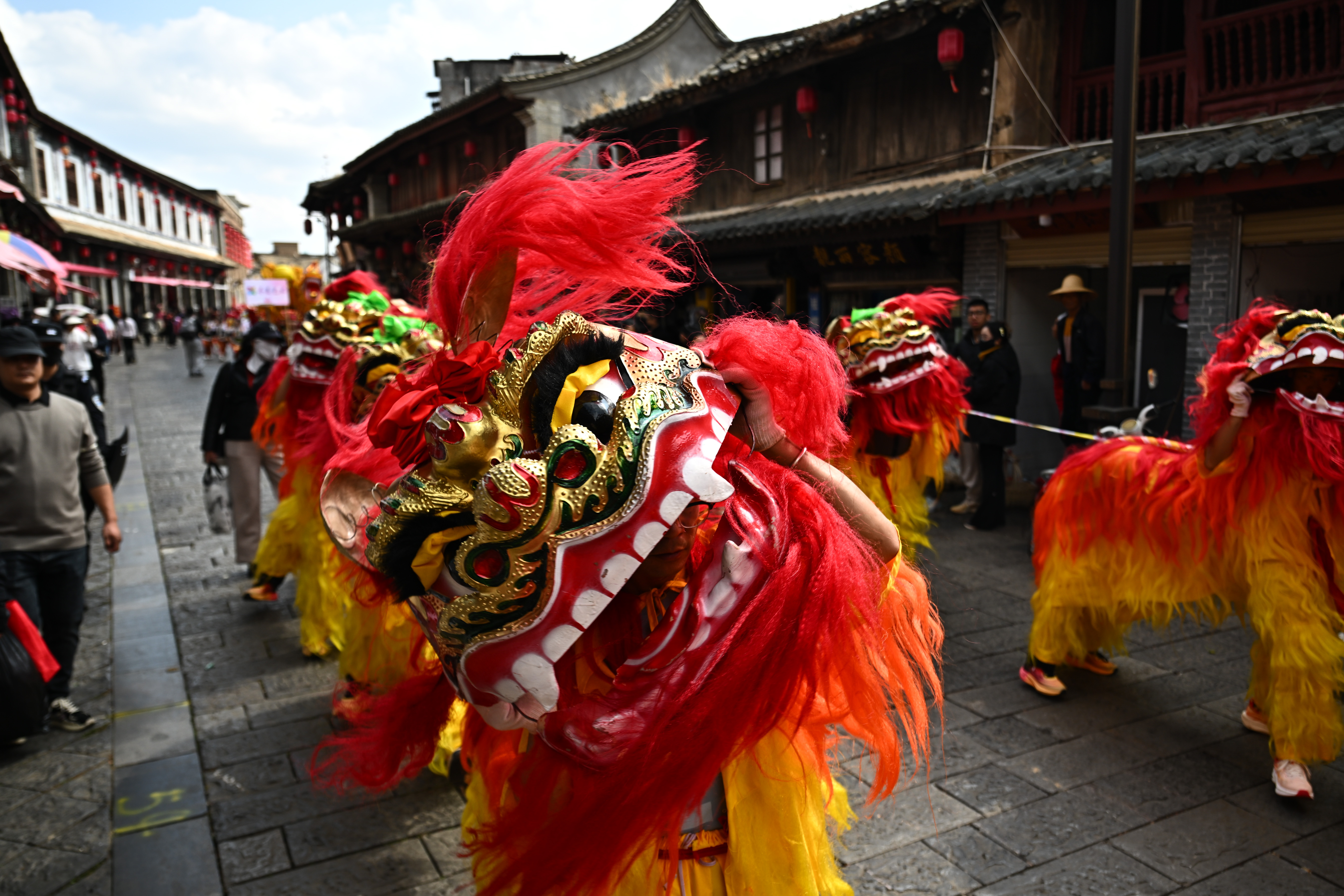 1月30日是农历正月初二,云南省红河哈尼族彝族自治州石屏县举行传统民俗巡演,为民众献上富有地方特色的春节民俗文化盛宴。图为舞狮巡游。中新社