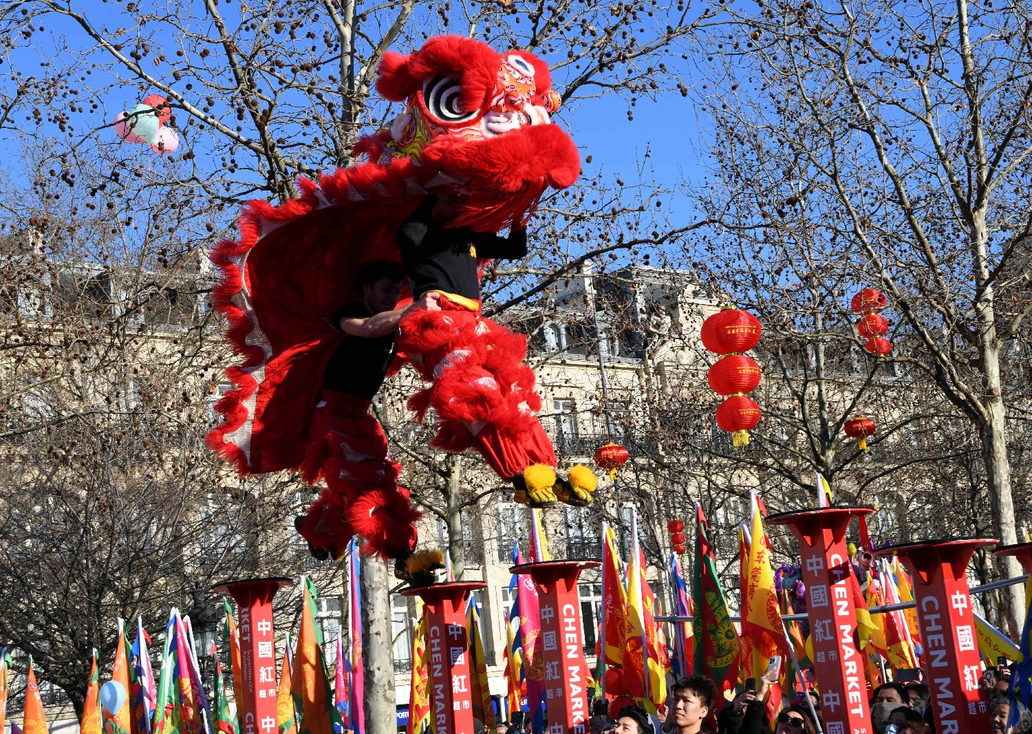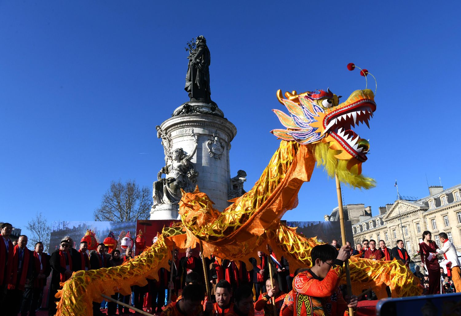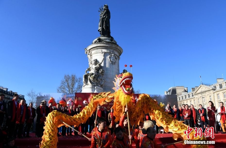 2月1日,旅法华侨华人春节庙会及美食节在法国首都巴黎的共和国广场举行。法国民众、外国游客和华侨华人摩肩擦踵,共同享受着中国春节带来的欢乐。图为当天的舞龙表演。中新社
