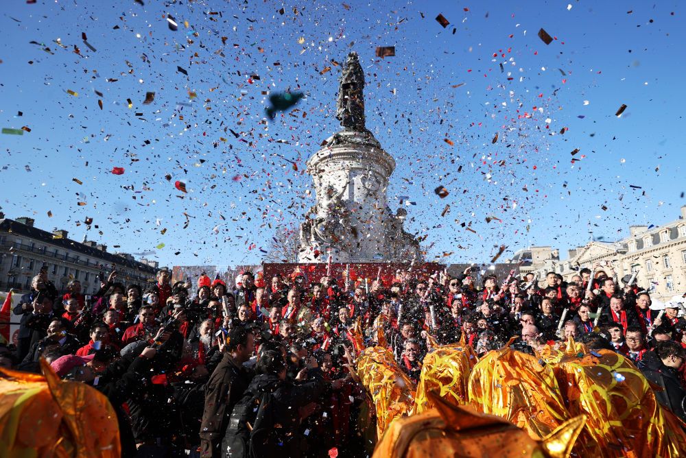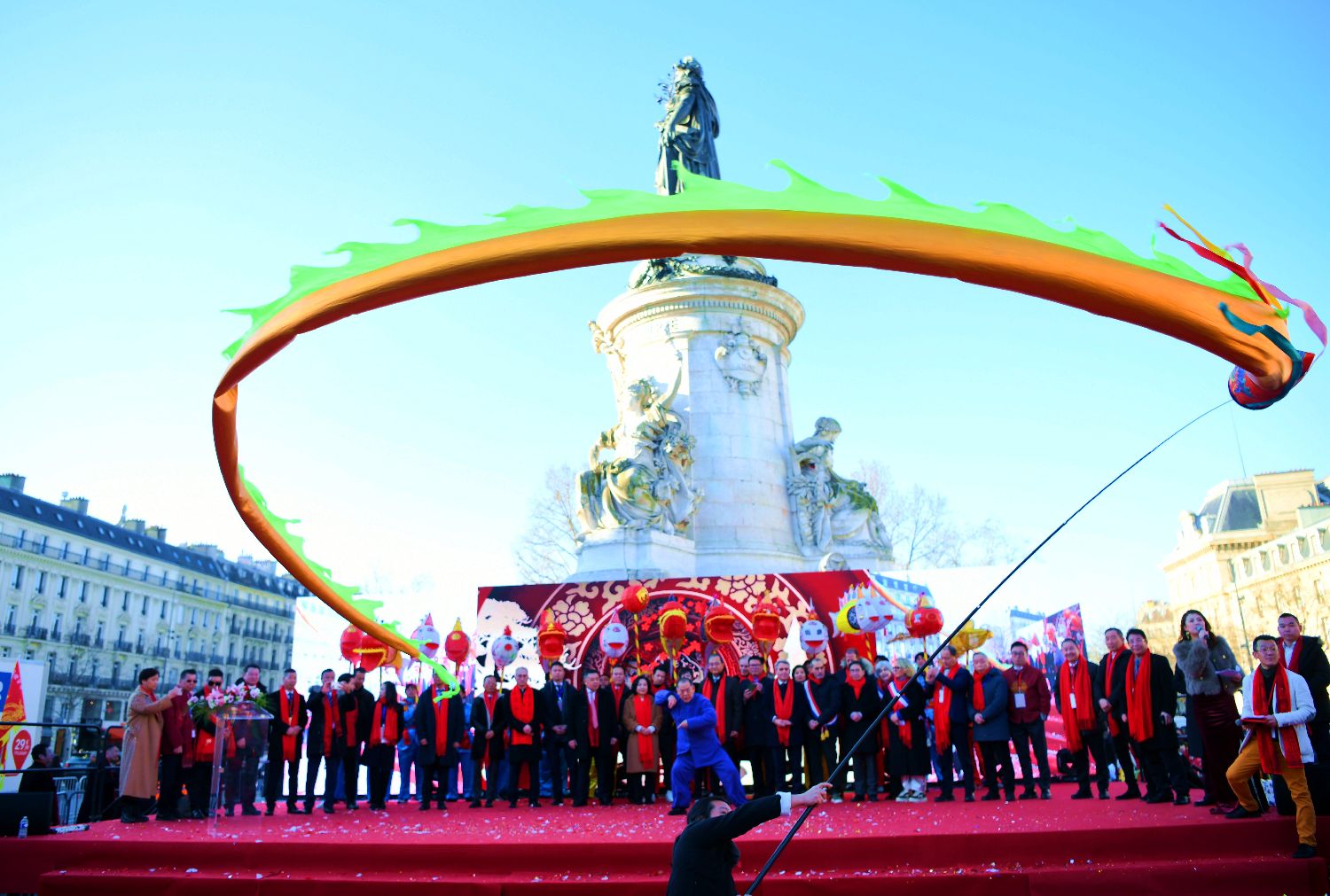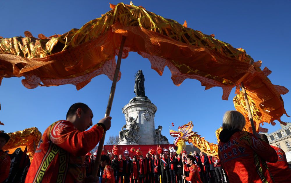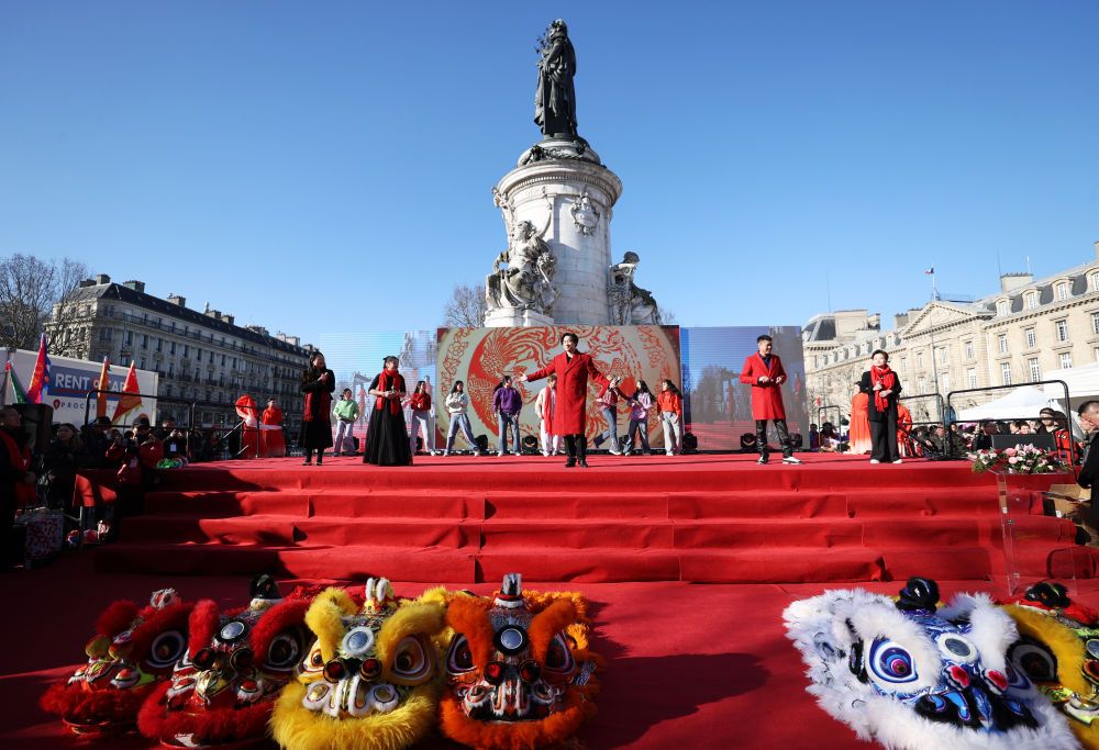 在法国巴黎共和国广场,与会嘉宾参加旅法华侨华人春节庙会及美食节开幕式。新华社