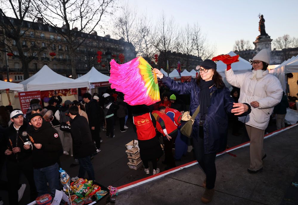 2月1日,在法国巴黎共和国广场举行的旅法华侨华人春节庙会及美食节上,一名法国女子学着扭秧歌。新华社