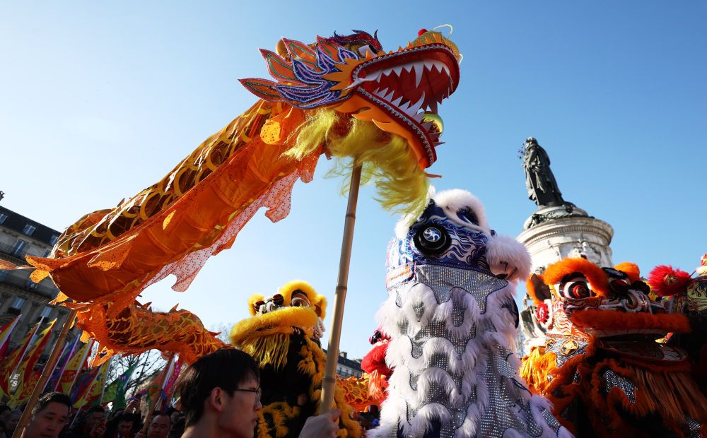 在法国巴黎共和国广场,演员在旅法华侨华人春节庙会及美食节开幕式上进行舞龙舞狮表演。新华社