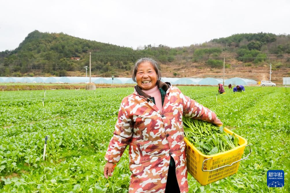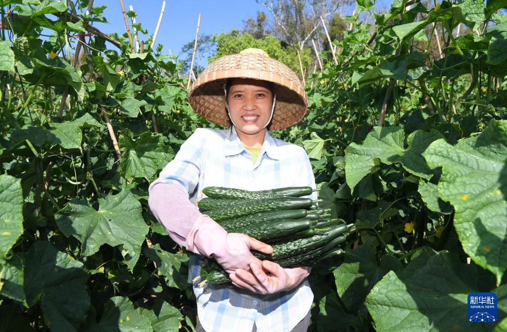 2月2日,在海南省三亚市育才生态区那受村,村民展示采摘的蔬菜。新华社
