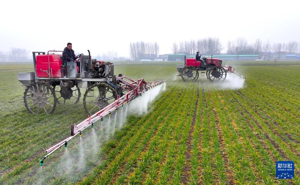 2月2日,在安徽省亳州市利辛县孙集镇许沟口村,农民驾驶机械进行田间管理(无人机照片)。新华社