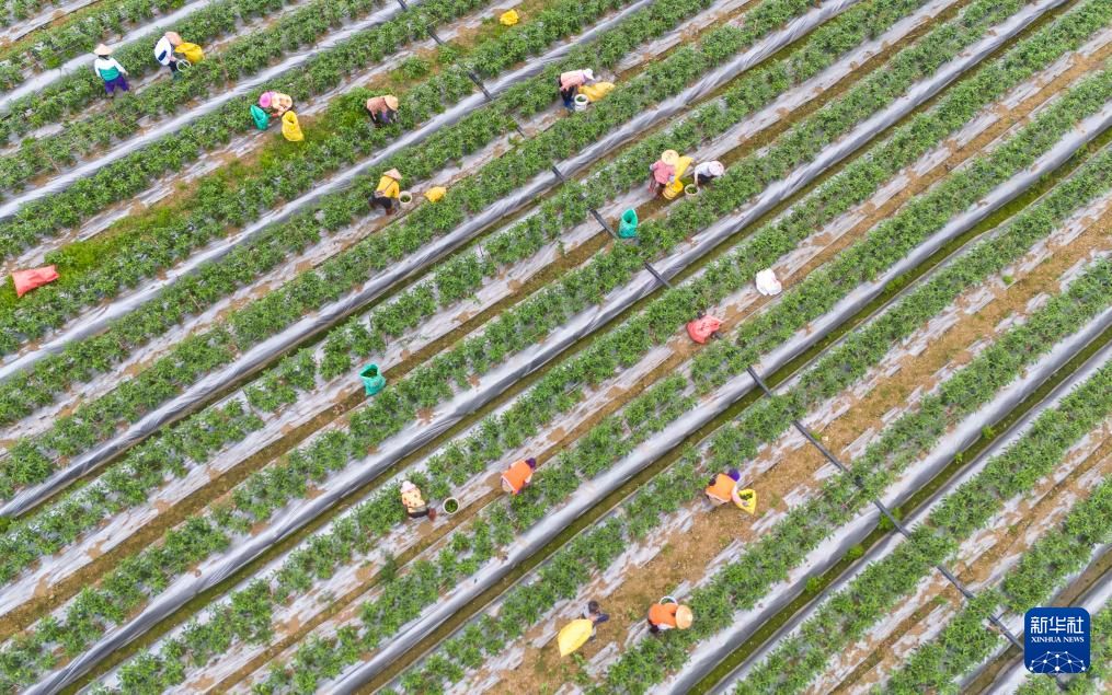 2月2日,海南省琼海市塔洋镇的农民在采收辣椒(无人机照片)。新华社