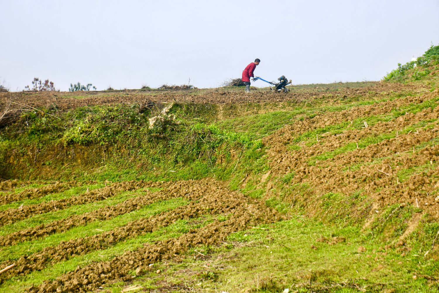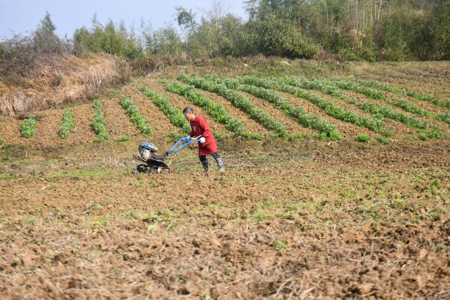 2月3日,四川省达州市,农民在田间用农机耕种。中新社