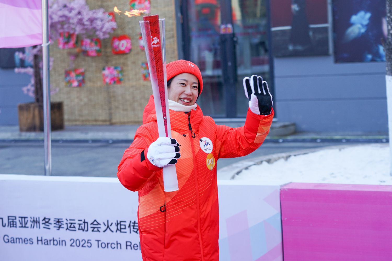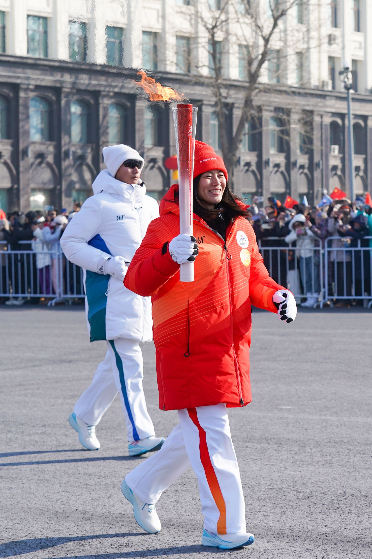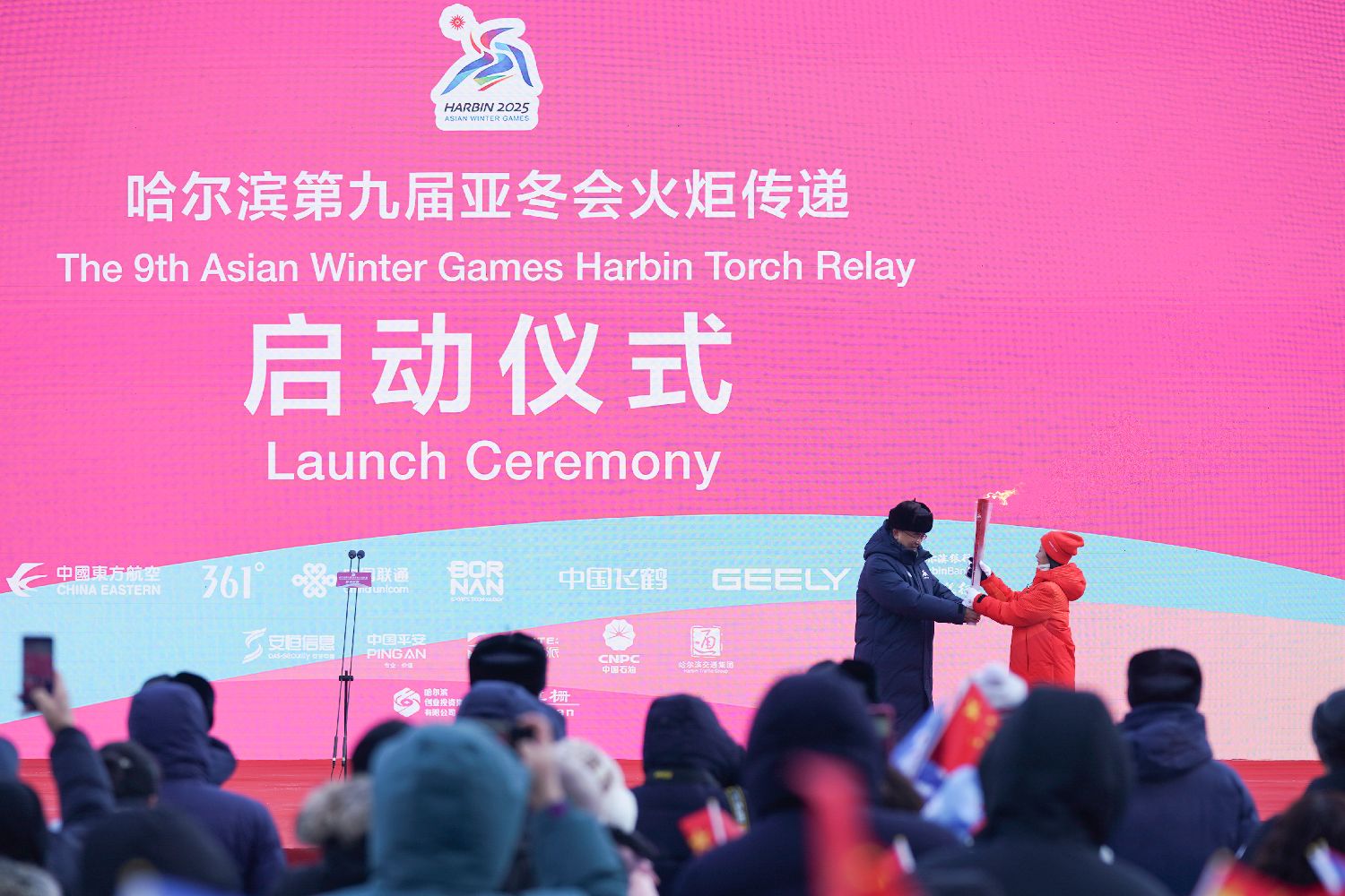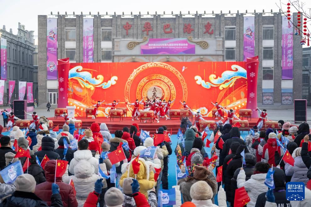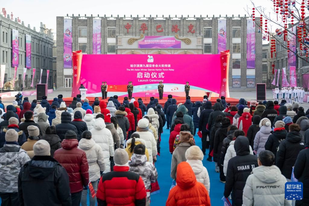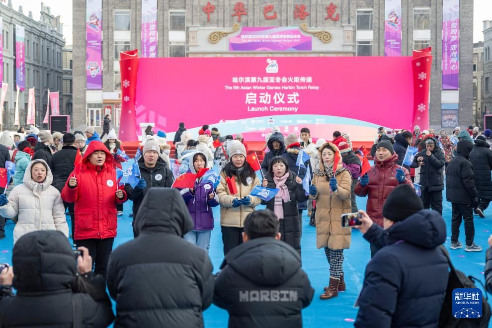 2月3日在哈尔滨市中华巴洛克历史文化街区拍摄的第九届亚冬会火炬传递启动仪式现场。新华社