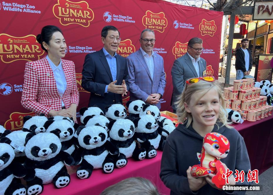 2月2日,美国加利福尼亚州圣迭戈动物园举办丰富多彩的文化活动欢庆乙巳蛇年春节。图为中国驻洛杉矶总领事郭少春及夫人王薇、美国圣迭戈动物园野生动植物联盟总裁兼首席执行官潘礼邦(PaulBaribault)等向游客们赠送春节礼物。中新网