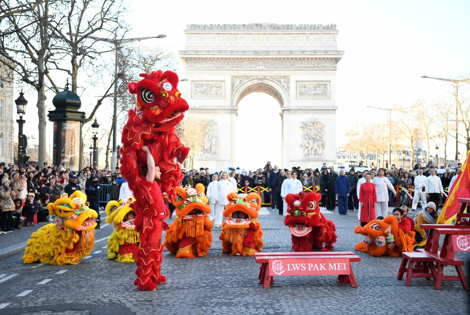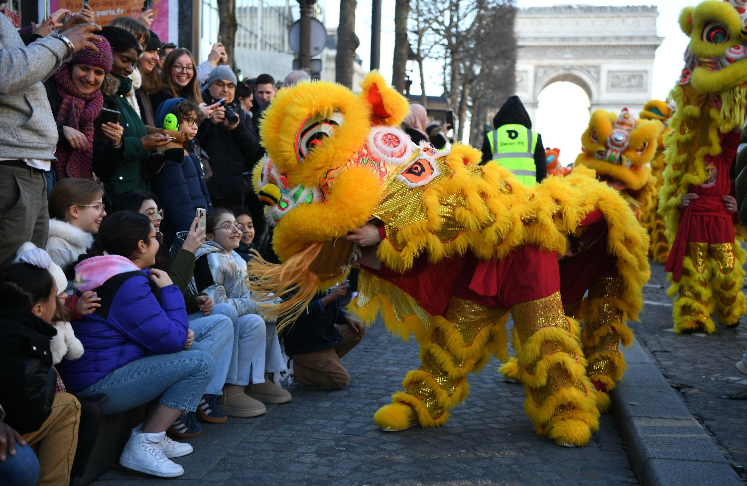 2月2日,法国巴黎香榭丽舍大街新春舞狮活动举行,庆祝蛇年春节到来,向当地民众送上新春祝福。中新社