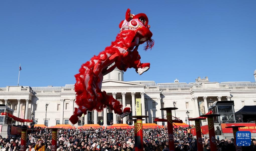2月2日,在英国伦敦市中心的特拉法加广场,演员表演舞狮。当日,英国伦敦举行多种活动,庆祝中国农历蛇年春节。新华社